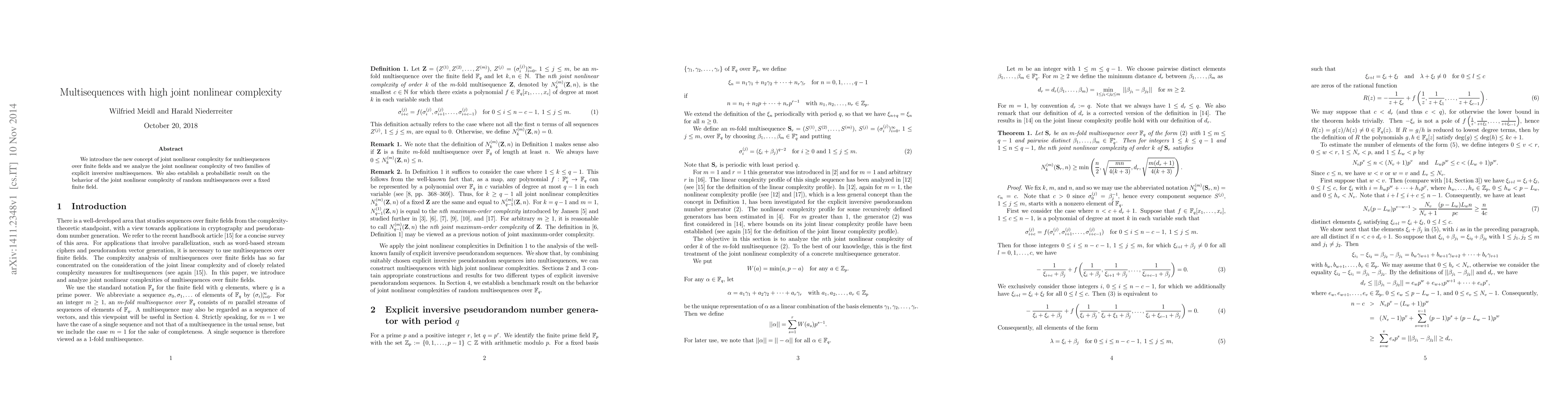 We introduce the new concept of joint nonlinear complexity for multisequences over finite fields and we analyze the joint nonlinear complexity of two families of explicit inversive multisequences. We also establish a probabilistic result on the behavior of the joint nonlinear complexity of random multisequences over a fixed finite field.