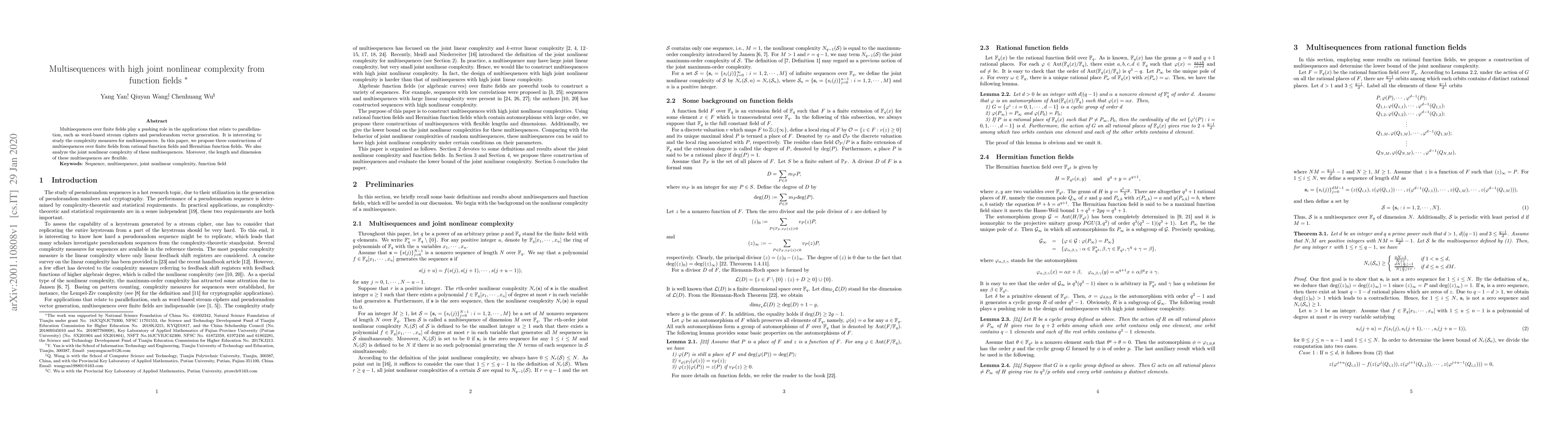 Multisequences over finite fields play a pushing role in the applications that relate to parallelization, such as word-based stream ciphers and pseudorandom vector generation. It is interesting to study the complexity measures for multisequences. In this paper, we propose three constructions of multisequences over finite fields from rational function fields and Hermitian function fields. We also analyze the joint nonlinear complexity of these multisequences. Moreover, the length and dimension of these multisequences are flexible.