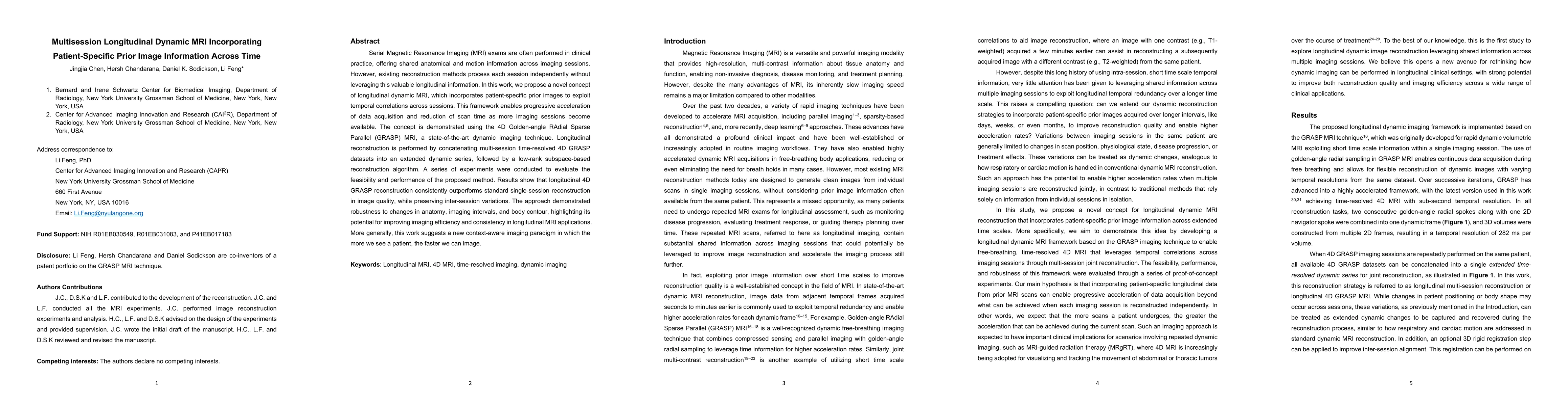 Serial Magnetic Resonance Imaging (MRI) exams are often performed in clinical practice, offering shared anatomical and motion information across imaging sessions. However, existing reconstruction methods process each session independently without leveraging this valuable longitudinal information. In this work, we propose a novel concept of longitudinal dynamic MRI, which incorporates patient-specific prior images to exploit temporal correlations across sessions. This framework enables progressive acceleration of data acquisition and reduction of scan time as more imaging sessions become available. The concept is demonstrated using the 4D Golden-angle RAdial Sparse Parallel (GRASP) MRI, a state-of-the-art dynamic imaging technique. Longitudinal reconstruction is performed by concatenating multi-session time-resolved 4D GRASP datasets into an extended dynamic series, followed by a low-rank subspace-based reconstruction algorithm. A series of experiments were conducted to evaluate the feasibility and performance of the proposed method. Results show that longitudinal 4D GRASP reconstruction consistently outperforms standard single-session reconstruction in image quality, while preserving inter-session variations. The approach demonstrated robustness to changes in anatomy, imaging intervals, and body contour, highlighting its potential for improving imaging efficiency and consistency in longitudinal MRI applications. More generally, this work suggests a new context-aware imaging paradigm in which the more we see a patient, the faster we can image.
