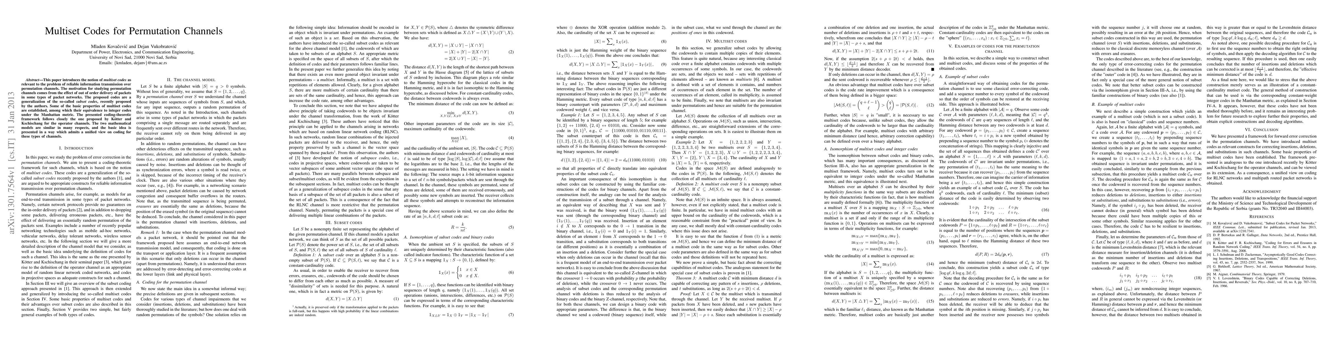 This paper proposes multiset codes for reliable information transmission over permutation channels, generalizing subset codes. It establishes their equivalence to integer codes under the Manhattan metric and aligns the framework with Koetter and Kschischang's operator channels model for a unified view on coding for these channels.
