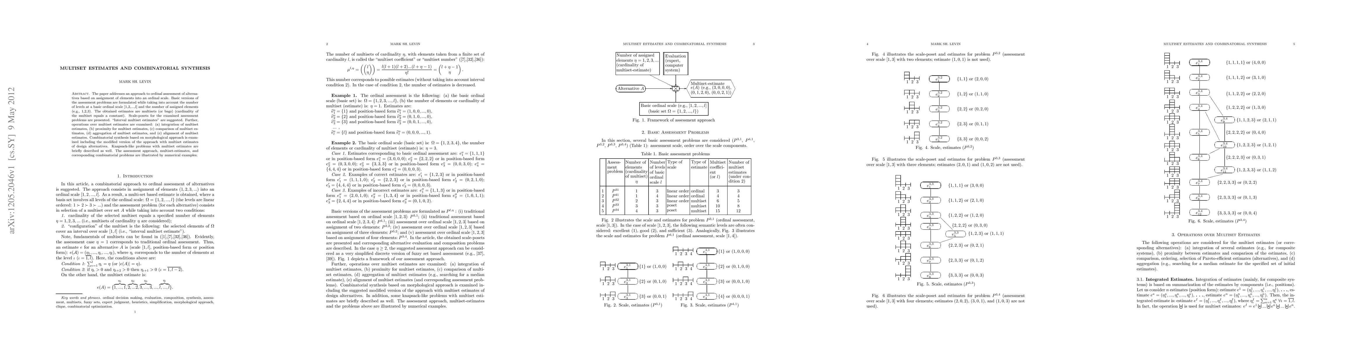 The paper addresses an approach to ordinal assessment of alternatives based on assignment of elements into an ordinal scale. Basic versions of the assessment problems are formulated while taking into account the number of levels at a basic ordinal scale [1,2,...,l] and the number of assigned elements (e.g., 1,2,3). The obtained estimates are multisets (or bags) (cardinality of the multiset equals a constant). Scale-posets for the examined assessment problems are presented. 'Interval multiset estimates' are suggested. Further, operations over multiset estimates are examined: (a) integration of multiset estimates, (b) proximity for multiset estimates, (c) comparison of multiset estimates, (d) aggregation of multiset estimates, and (e) alignment of multiset estimates. Combinatorial synthesis based on morphological approach is examined including the modified version of the approach with multiset estimates of design alternatives. Knapsack-like problems with multiset estimates are briefly described as well. The assessment approach, multiset-estimates, and corresponding combinatorial problems are illustrated by numerical examples.