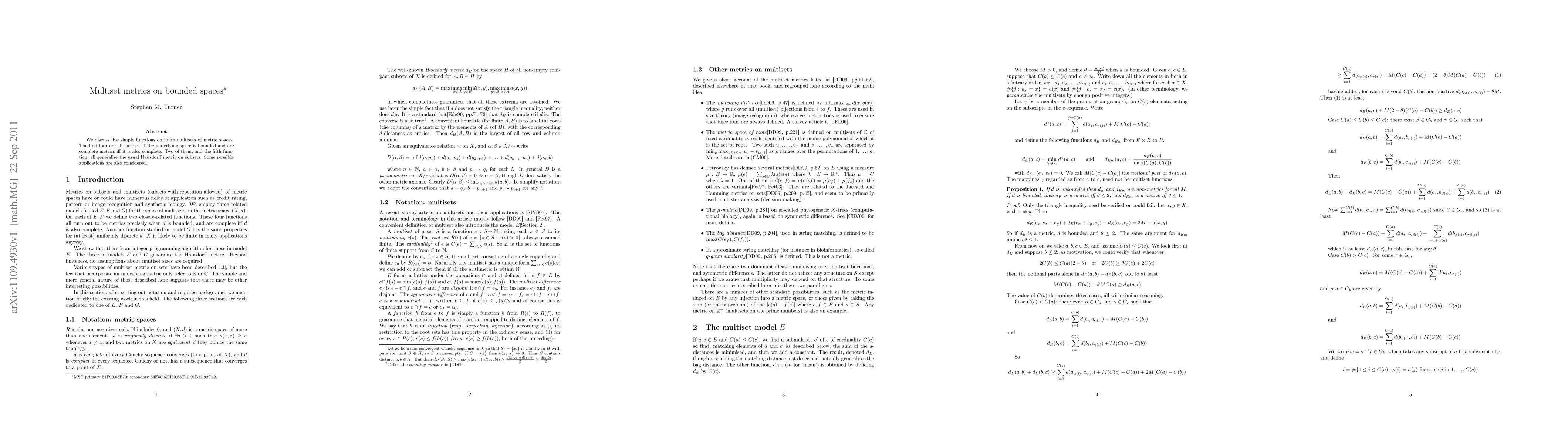 We discuss five simple functions on finite multisets of metric spaces. The first four are all metrics iff the underlying space is bounded and are complete metrics iff it is also complete. Two of them, and the fifth function, all generalise the usual Hausdorff metric on subsets. Some possible applications are also considered.
