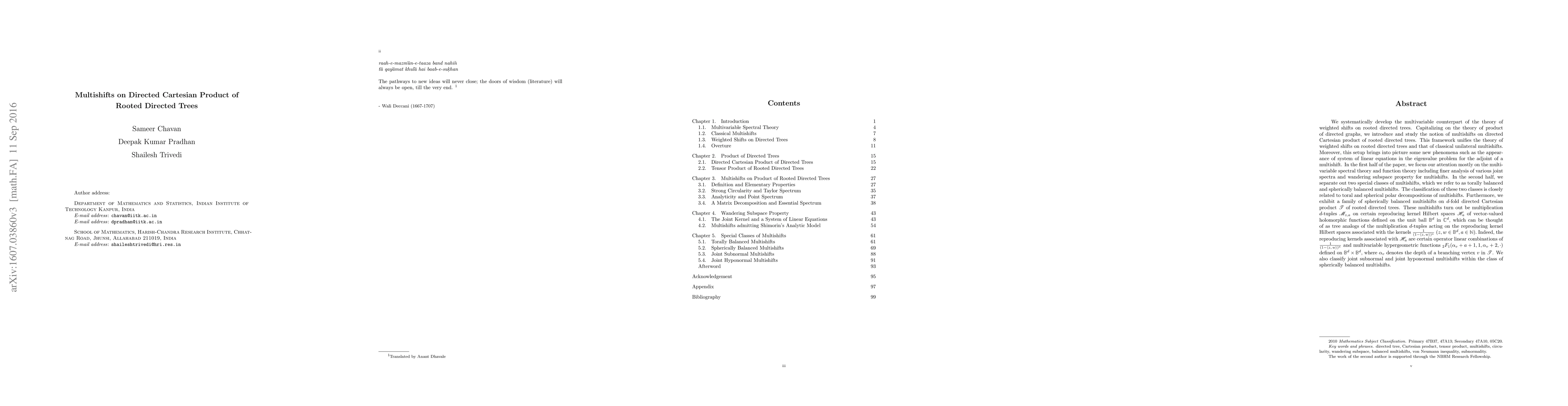 We systematically develop the multivariable counterpart of the theory of weighted shifts on rooted directed trees. Capitalizing on the theory of product of directed graphs, we introduce and study the notion of multishifts on directed Cartesian product of rooted directed trees. This framework unifies the theory of weighted shifts on rooted directed trees and that of classical unilateral multishifts. Moreover, this setup brings into picture some new phenomena such as the appearance of system of linear equations in the eigenvalue problem for the adjoint of a multishift. In the first half of the paper, we focus our attention mostly on the multivariable spectral theory and function theory including finer analysis of various joint spectra and wandering subspace property for multishifts. In the second half, we separate out two special classes of multishifts, which we refer to as torally balanced and spherically balanced multishifts. The classification of these two classes is closely related to toral and spherical polar decompositions of multishifts. Furthermore, we exhibit a family of spherically balanced multishifts on $d$-fold directed Cartesian product $\mathscr T$ of rooted directed trees. These multishifts turn out be multiplication $d$-tuples $\mathscr M_{z, a}$ on certain reproducing kernel Hilbert spaces $\mathscr H_a$ of vector-valued holomorphic functions defined on the unit ball $\mathbb B^d$ in $\mathbb C^d$, which can be thought of as tree analogs of the multiplication $d$-tuples acting on the reproducing kernel Hilbert spaces associated with the kernels $\frac{1}{(1-\langle{z},{{w}\rangle})^a}~(z, w \in \mathbb B^d, a \in \mathbb N).$
