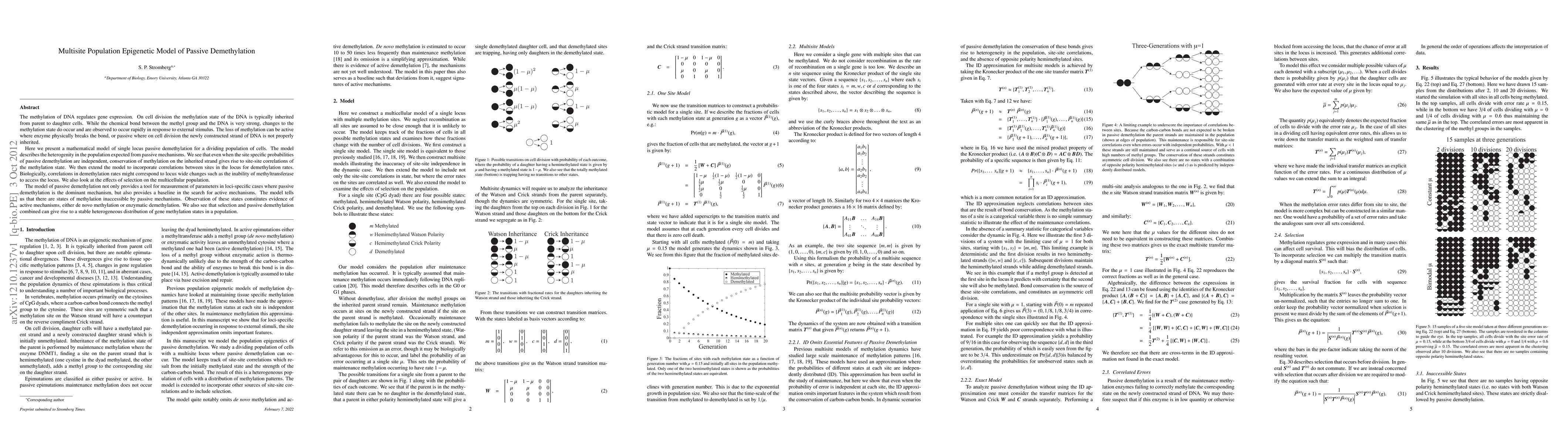 The methylation of DNA regulates gene expression. On cell division the methylation state of the DNA is typically inherited from parent to daughter cells. While the chemical bond between the methyl group and the DNA is very strong, changes to the methylation state do occur and are observed to occur rapidly in response to external stimulus. The loss of methylation can be active where enzyme physically breaks the bond, or passive where on cell division the newly constructed strand of DNA is not properly inherited. Here we present a mathematical model of single locus passive demethylation for a dividing population of cells. The model describes the heterogenity in the population expected from passive mechanisms. We see that even when the site specific probabilities of passive demethylation are independent, conservation of methylation on the inherited strand gives rise to site-site correlations of the methylation state. We then extend the model to incorporate correlations between sites in the locus for demethylation rates. Biologically, correlations in demethylation rates might correspond to locus wide changes such as the inability of methyltransferase to access the locus. We also look at the effects of selection on the multicellular population. The model of passive demethylation not only provides a tool for measurement of parameters in loci-specific cases where passive demethylation is the dominant mechanism, but also provides a baseline in the search for active mechanisms. The model tells us that there are states of methylation inaccessible by passive mechanisms. Observation of these states constitutes evidence of active mechanisms, either de novo methylation or enzymatic demethylation. We also see that selection and passive demethylation combined can give rise to a stable heterogeneous distribution of gene methylation states in a population.