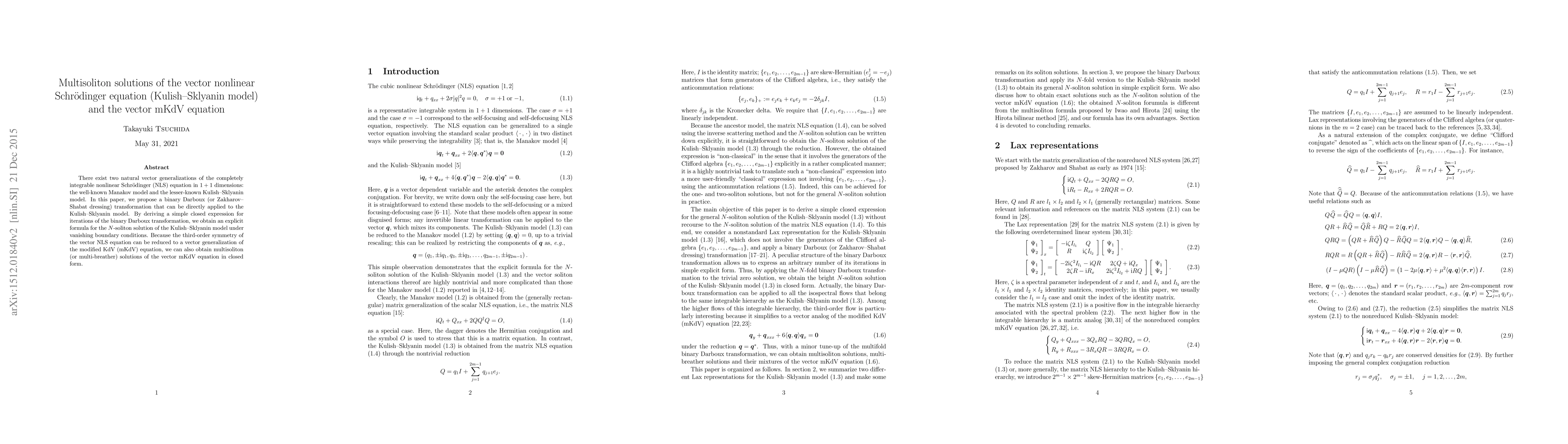 This paper proposes a binary Darboux transformation for the Kulish-Sklyanin model, yielding an explicit formula for its $N$-soliton solutions. It also extends this method to derive multisoliton solutions for the vector modified KdV equation.