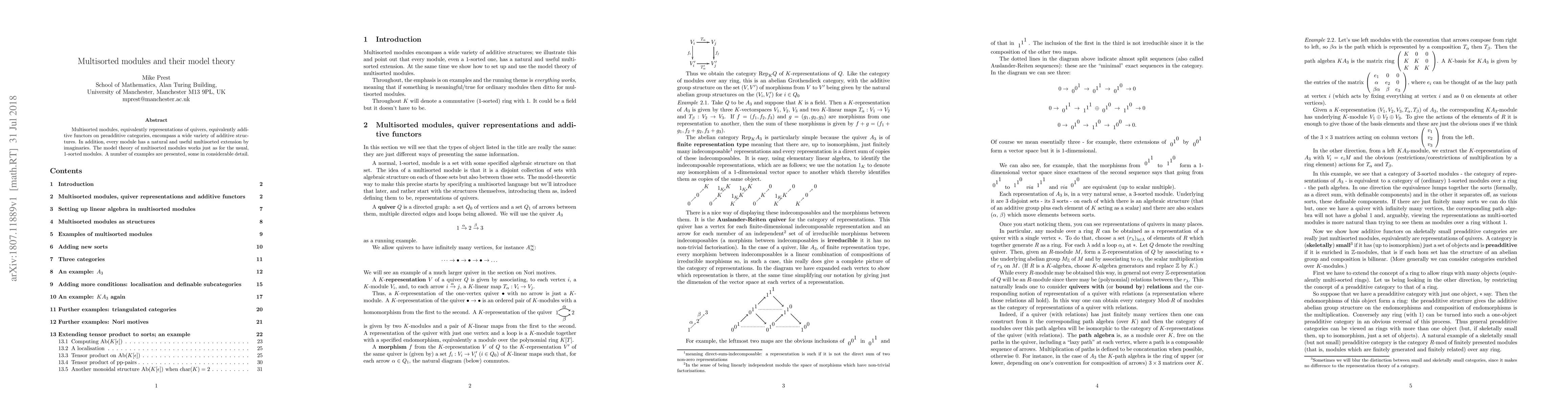This paper explores the model theory of multisorted modules, which are representations of quivers, and shows that their model theory parallels that of 1-sorted modules. It also discusses the extension of modules through imaginaries and provides detailed examples.