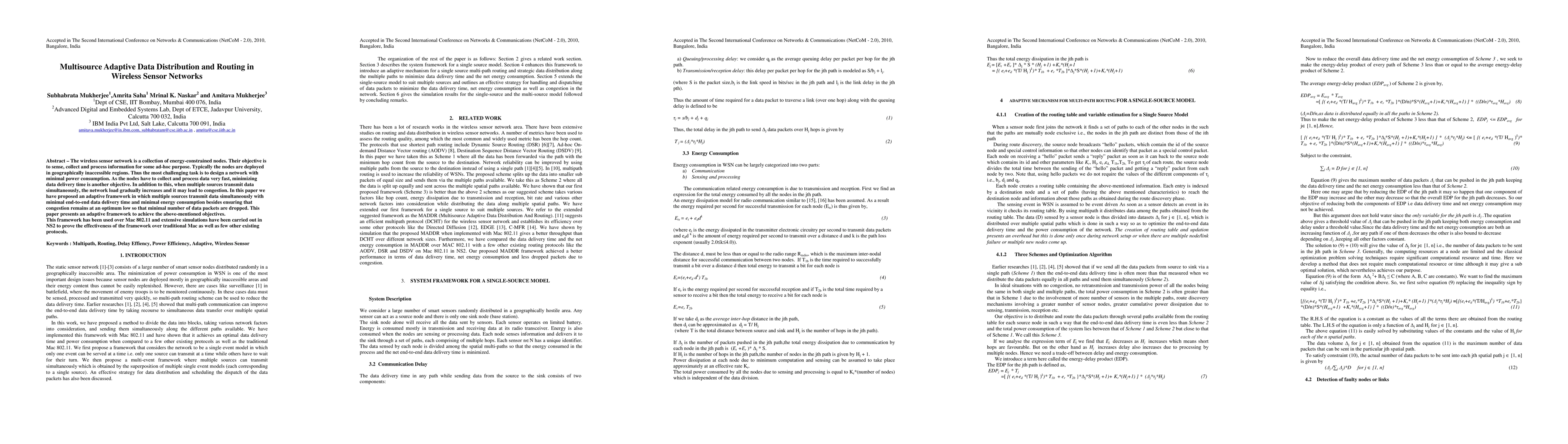 This paper proposes an adaptive framework for multisource data distribution in wireless sensor networks to minimize energy consumption and data delivery time while maintaining low congestion and packet drop rates. Extensive simulations using NS2 demonstrate the framework's effectiveness over traditional and other existing protocols.