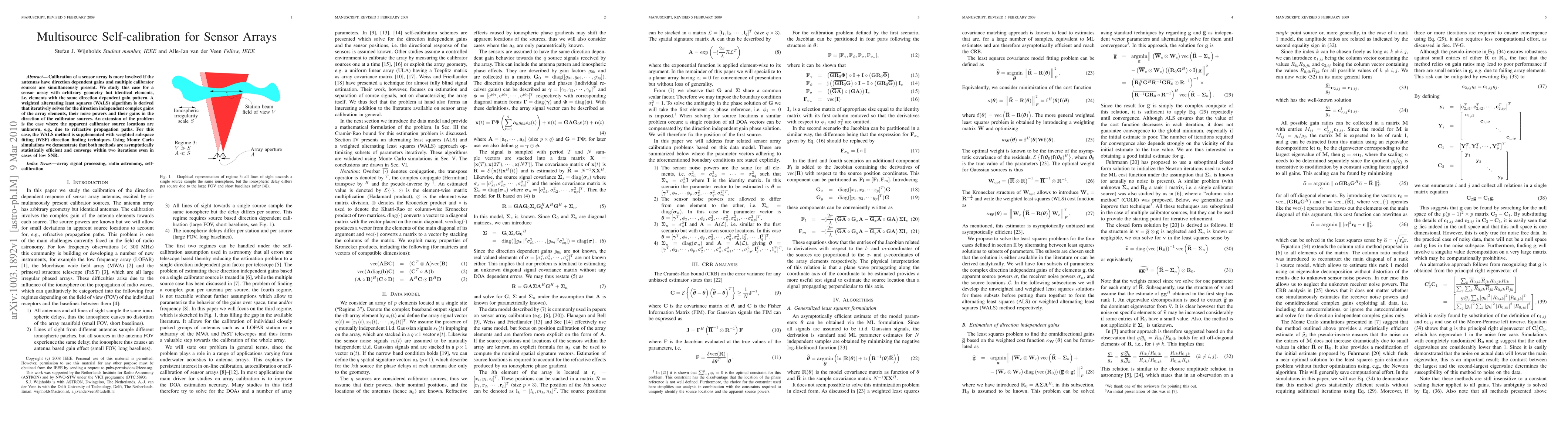 This paper proposes a weighted alternating least squares (WALS) algorithm for calibrating sensor arrays with direction-dependent gains and multiple simultaneous calibrator sources. It extends the method with weighted subspace fitting (WSF) for unknown calibrator source locations, demonstrating convergence within two iterations via Monte Carlo simulations.
