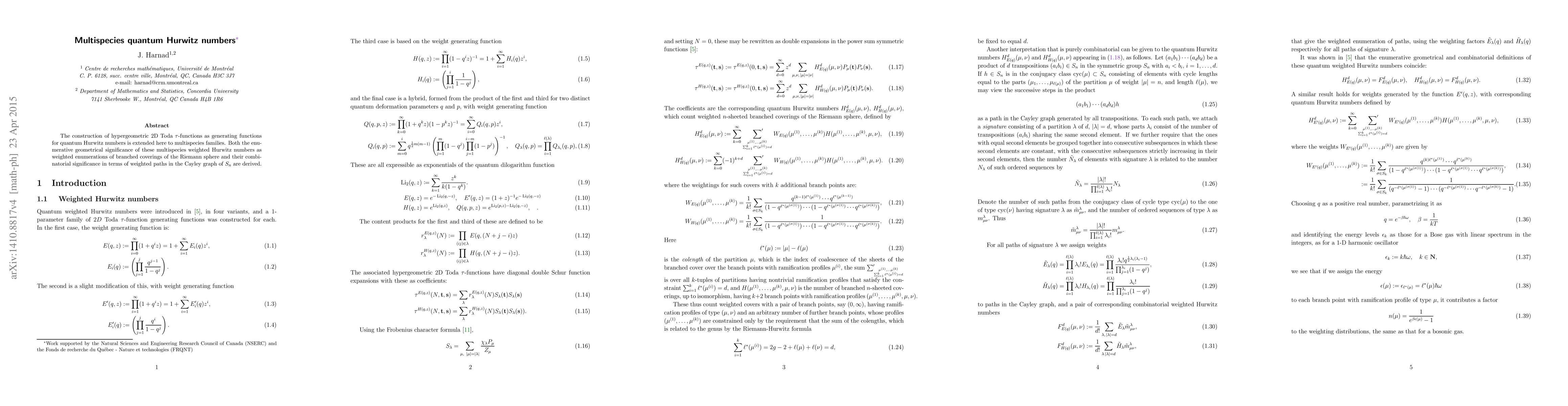 The construction of hypergeometric 2D Toda $\tau$-functions as generating functions for quantum Hurwitz numbers is extended here to multispecies families. Both the enumerative geometrical significance of these multispecies quantum Hurwitz numbers as weighted enumerations of branched coverings of the Riemann sphere and their combinatorial significance in terms of weighted paths in the Cayley graph of $S_n$ are derived.