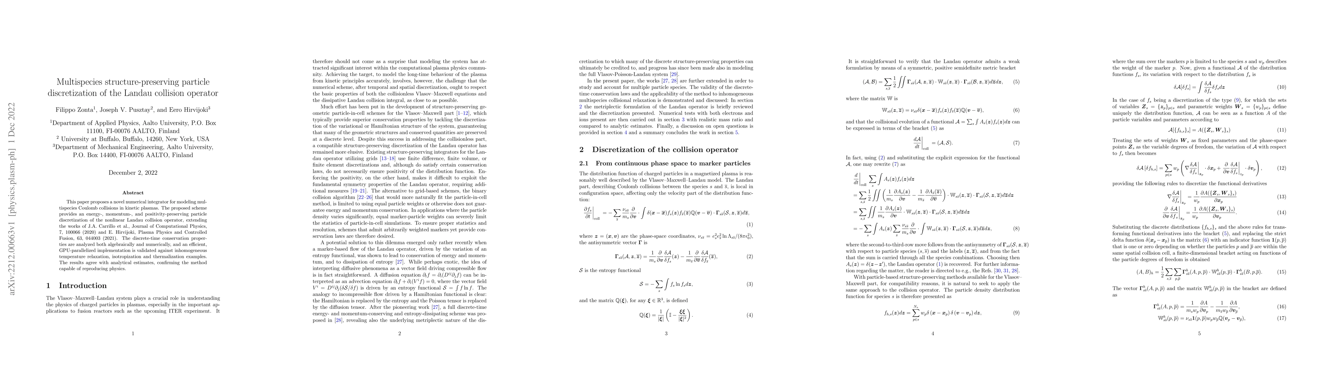 This paper proposes a novel numerical integrator for modeling multispecies Coulomb collisions in kinetic plasmas. The proposed scheme provides an energy-, momentum-, and positivity-preserving particle discretization of the nonlinear Landau collision operator, extending the works of J.A. Carrillo et al., Journal of Computational Physics, 7, 100066 (2020) and E. Hirvijoki, Plasma Physics and Controlled Fusion, 63, 044003 (2021). The discrete-time conservation properties are analyzed both algebraically and numerically, and an efficient, GPU-parallelized implementation is validated against inhomogeneous temperature relaxation, isotropization and thermalization examples. The results agree with analytical estimates, confirming the method capable of reproducing physics.