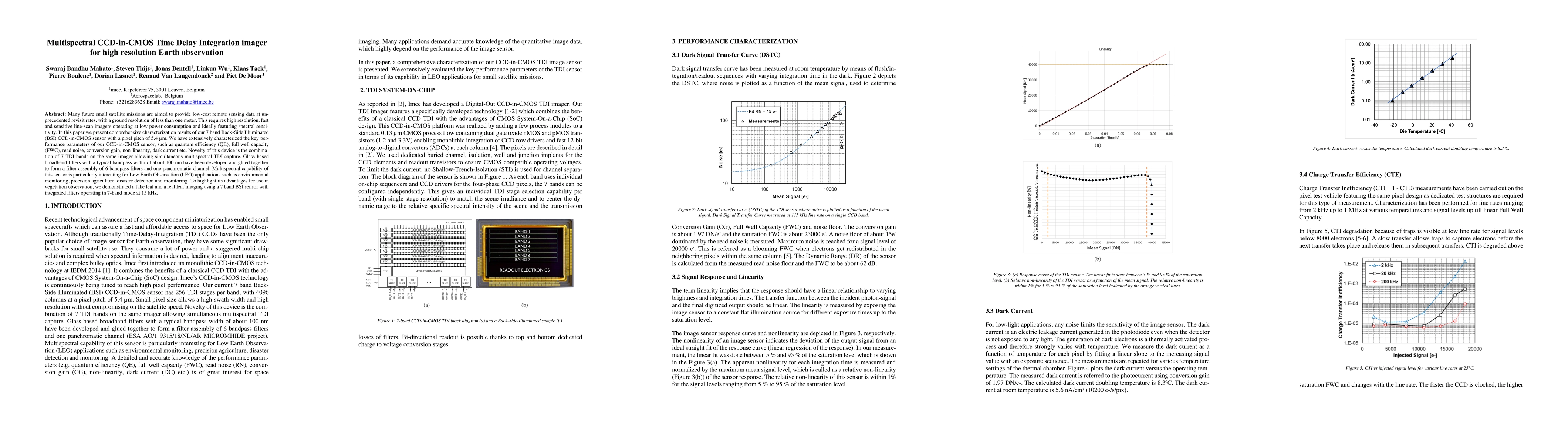 Many future small satellite missions are aimed to provide low-cost remote sensing data at unprecedented revisit rates, with a ground resolution of less than one meter. This requires high resolution, fast and sensitive line-scan imagers operating at low power consumption and ideally featuring spectral sensitivity. In this paper we present comprehensive characterization results of our 7 band Back-Side Illuminated (BSI) CCD-in-CMOS sensor with a pixel pitch of 5.4 um. We have extensively characterized the key performance parameters of our CCD-in-CMOS sensor, such as quantum efficiency (QE), full well capacity (FWC), read noise, conversion gain, non-linearity, dark current etc. Novelty of this device is the combination of 7 TDI bands on the same imager allowing simultaneous multispectral TDI capture. Glass-based broadband filters with a typical band-pass width of about 100 nm have been developed and glued together to form a filter assembly of 6 band-pass filters and one panchromatic channel. Multispectral capability of this sensor is particularly interesting for Low Earth Observation (LEO) applications such as environmental monitoring, precision agriculture, disaster detection and monitoring. To highlight its ad-vantages for use in vegetation observation, we demonstrated a fake leaf and a real leaf imaging using a 7 band BSI sensor with integrated filters operating in 7-band mode at 15 kHz.