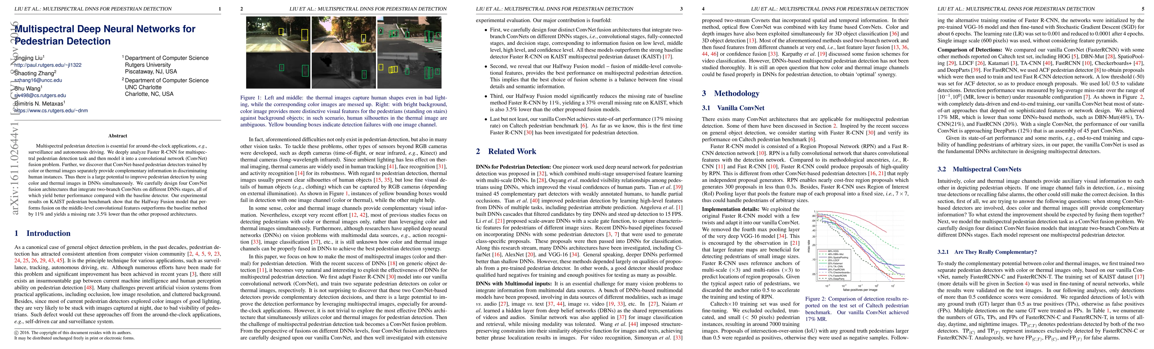 This paper explores multispectral deep neural networks for pedestrian detection using both color and thermal images. It proposes four convolutional network fusion architectures that integrate color and thermal image information at different stages, demonstrating that combining these modalities improves detection performance. The Halfway Fusion model, which fuses features at the middle-level, achieves the best results, outperforming the baseline by 11% and reducing the missing rate by 3.5% on the KAIST benchmark.