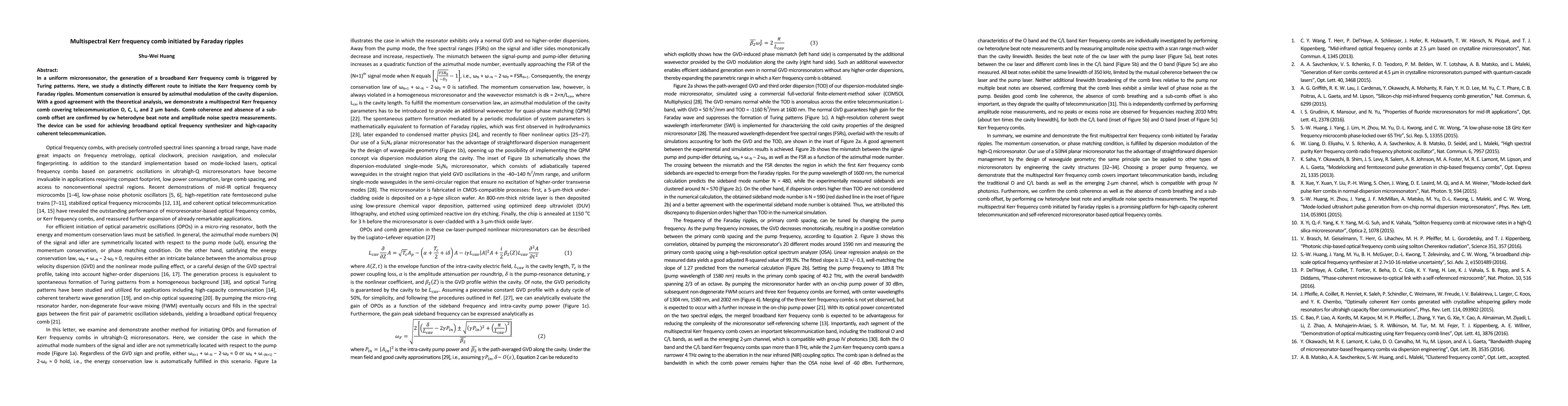 This study demonstrates a novel method for generating a multispectral Kerr frequency comb initiated by Faraday ripples in a microresonator, ensuring momentum conservation through azimuthal modulation. The comb covers telecommunication bands O, C, L, and 2 μm, with high comb coherence confirmed by heterodyne measurements.