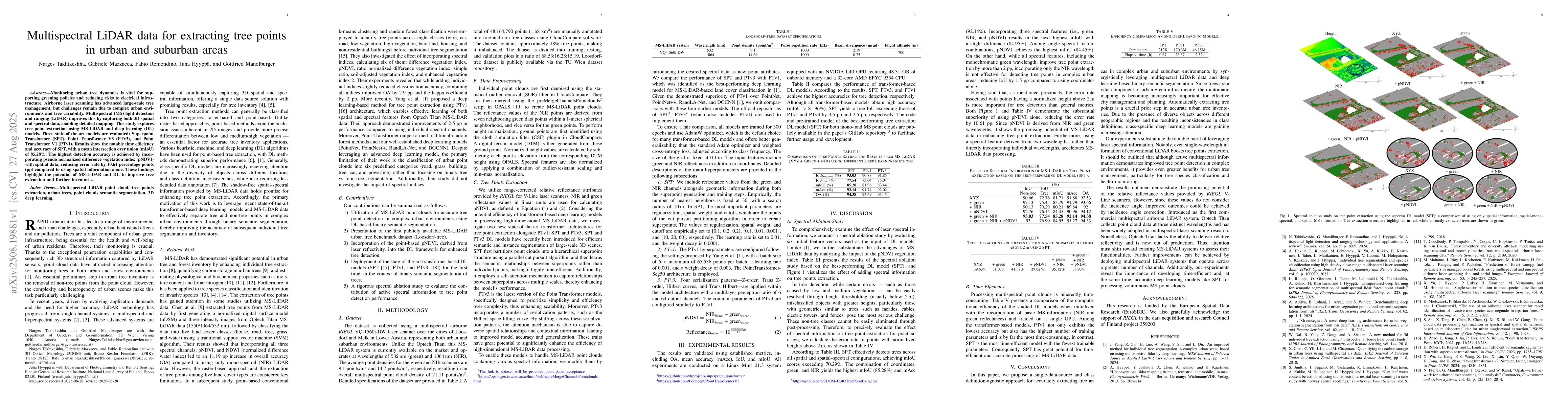 Monitoring urban tree dynamics is vital for supporting greening policies and reducing risks to electrical infrastructure. Airborne laser scanning has advanced large-scale tree management, but challenges remain due to complex urban environments and tree variability. Multispectral (MS) light detection and ranging (LiDAR) improves this by capturing both 3D spatial and spectral data, enabling detailed mapping. This study explores tree point extraction using MS-LiDAR and deep learning (DL) models. Three state-of-the-art models are evaluated: Superpoint Transformer (SPT), Point Transformer V3 (PTv3), and Point Transformer V1 (PTv1). Results show the notable time efficiency and accuracy of SPT, with a mean intersection over union (mIoU) of 85.28%. The highest detection accuracy is achieved by incorporating pseudo normalized difference vegetation index (pNDVI) with spatial data, reducing error rate by 10.61 percentage points (pp) compared to using spatial information alone. These findings highlight the potential of MS-LiDAR and DL to improve tree extraction and further tree inventories.