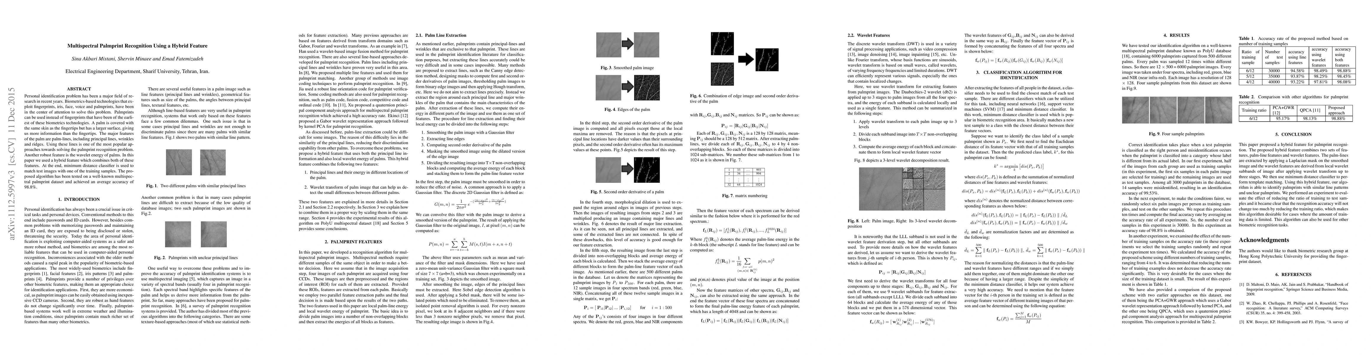 This paper proposes a hybrid feature-based approach for multispectral palmprint recognition, combining palm-lines and wavelet energy features, and achieves an average accuracy of 98.8% using a minimum distance classifier on a well-known dataset.