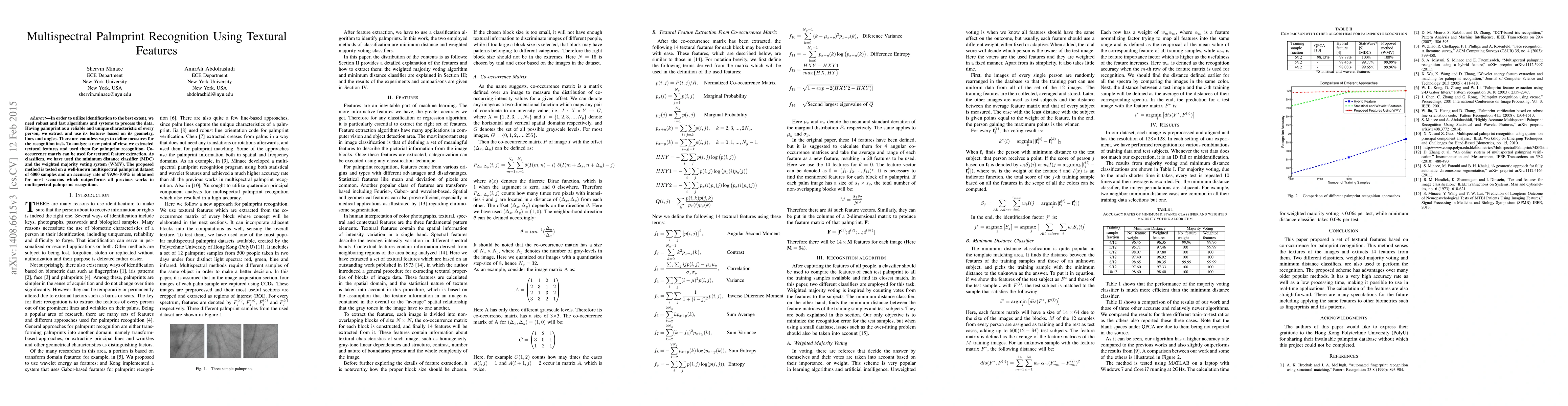 This paper proposes a robust multispectral palmprint recognition method using textural features extracted via co-occurrence matrix, employing minimum distance classifier and weighted majority voting system. The method achieves an accuracy rate of 99.96-100% on a dataset of 6000 samples, outperforming previous recognition techniques.