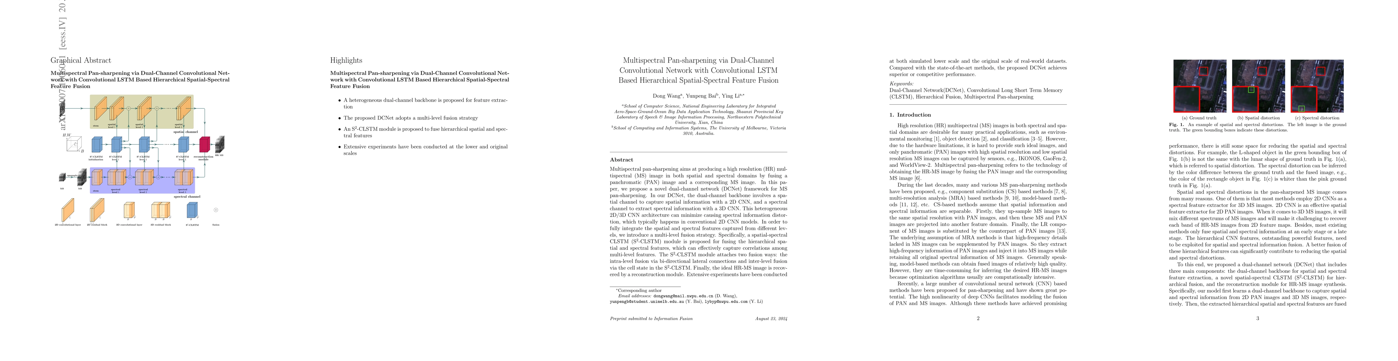 This paper proposes a dual-channel convolutional network (DCNet) for multispectral pan-sharpening, integrating spatial and spectral information through a 2D CNN and 3D CNN respectively. A spatial-spectral CLSTM module is introduced for hierarchical feature fusion, achieving superior performance in generating high-resolution multispectral images.