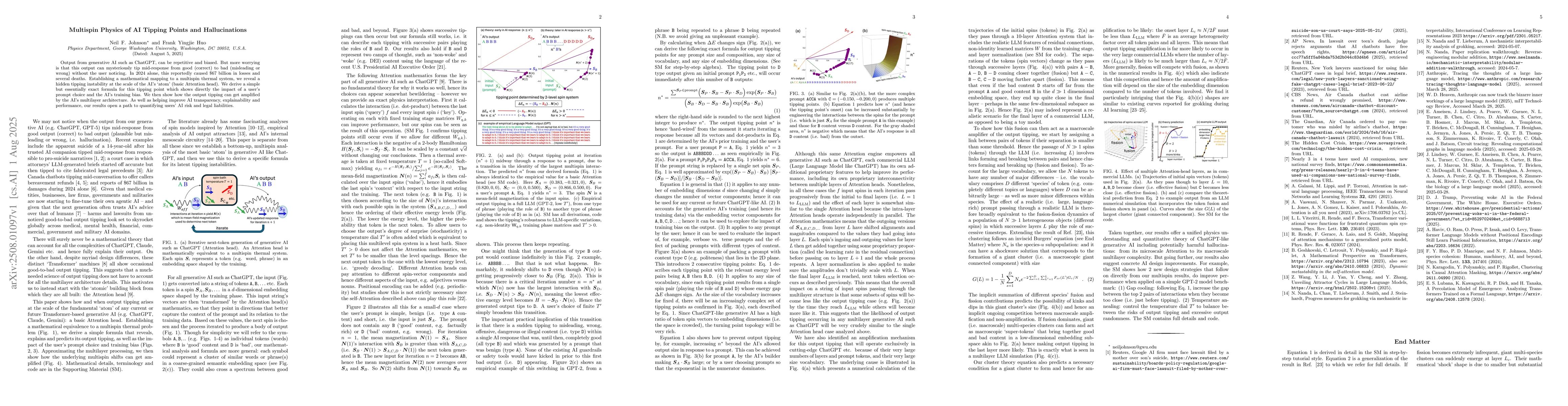 Output from generative AI such as ChatGPT, can be repetitive and biased. But more worrying is that this output can mysteriously tip mid-response from good (correct) to bad (misleading or wrong) without the user noticing. In 2024 alone, this reportedly caused $67 billion in losses and several deaths. Establishing a mathematical mapping to a multispin thermal system, we reveal a hidden tipping instability at the scale of the AI's 'atom' (basic Attention head). We derive a simple but essentially exact formula for this tipping point which shows directly the impact of a user's prompt choice and the AI's training bias. We then show how the output tipping can get amplified by the AI's multilayer architecture. As well as helping improve AI transparency, explainability and performance, our results open a path to quantifying users' AI risk and legal liabilities.