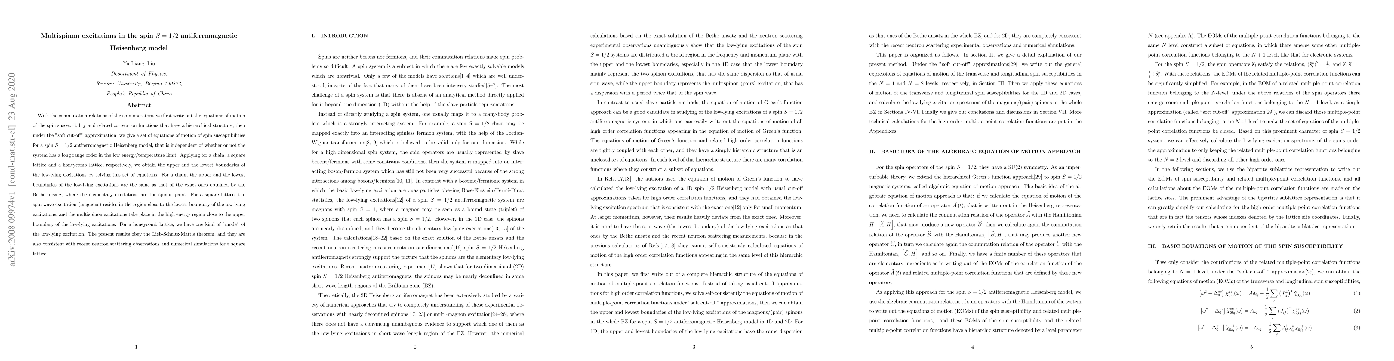 This paper investigates multispinon excitations in the spin S=1/2 antiferromagnetic Heisenberg model using equations of motion under the "soft cut-off" approximation. It finds that the low-lying excitations' boundaries match exact Bethe ansatz results for a chain, while multispinon excitations are identified in the high-energy region for a square lattice and a single "mode" for a honeycomb lattice.