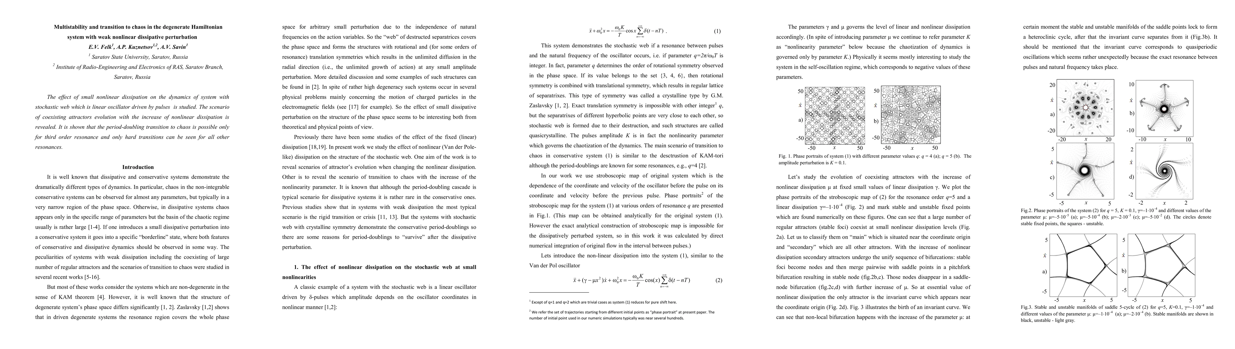 This paper investigates how minor nonlinear dissipative effects influence the dynamics of a degenerate Hamiltonian system driven by pulses, revealing multistability and the evolution of coexisting attractors. It demonstrates that period-doubling chaos occurs only for third-order resonance, while other resonances exhibit only hard transitions.