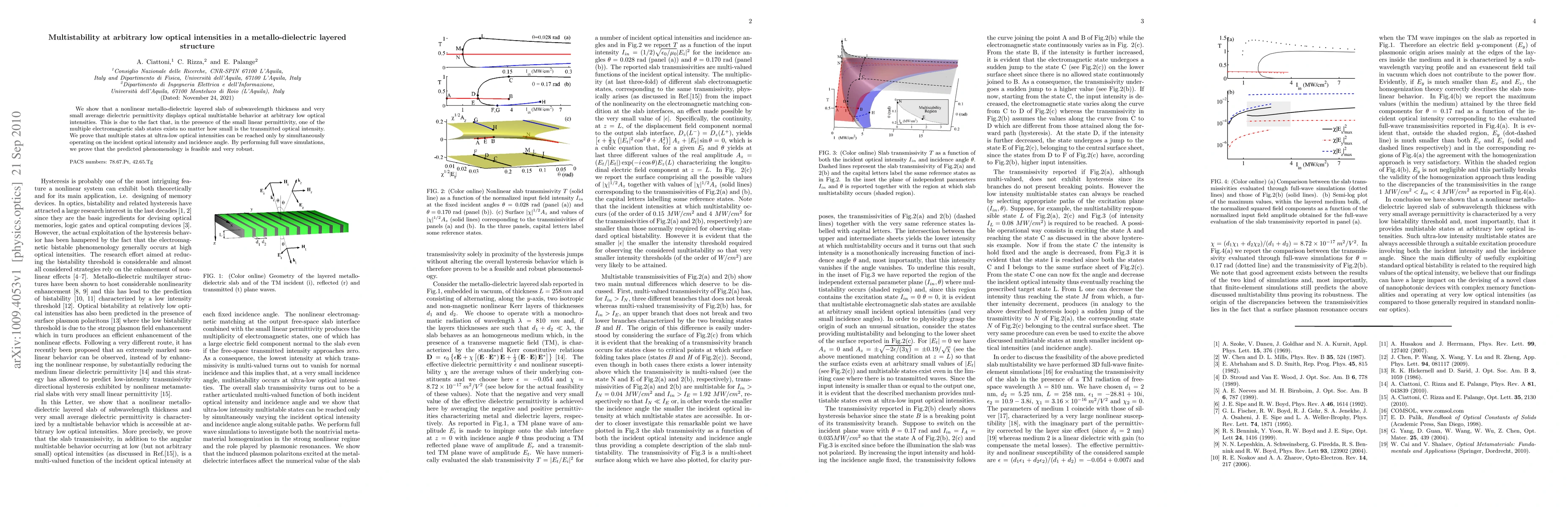 We show that a nonlinear metallo-dielectric layered slab of subwavelength thickness and very small average dielectric permittivity displays optical multistable behavior at arbitrary low optical intensities. This is due to the fact that, in the presence of the small linear permittivity, one of the multiple electromagnetic slab states exists no matter how small is the transmitted optical intensity. We prove that multiple states at ultra-low optical intensities can be reached only by simultaneously operating on the incident optical intensity and incidence angle. By performing full wave simulations, we prove that the predicted phenomenology is feasible and very robust.