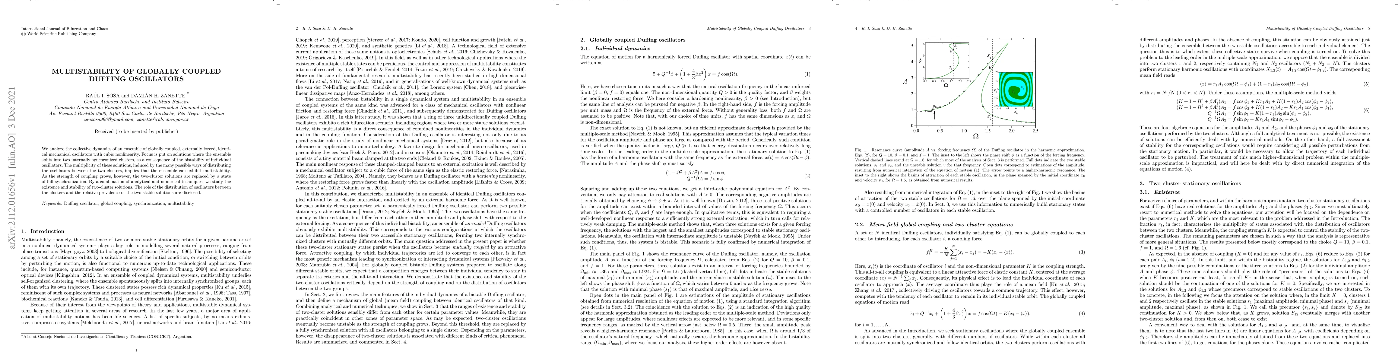 This paper investigates the dynamics of globally coupled, externally forced mechanical oscillators with cubic nonlinearity, focusing on scenarios where the ensemble splits into two synchronized clusters due to individual oscillator bistability. It explores the multistability phenomena and transitions to full synchronization as coupling strength increases, using analytical and numerical methods to study the existence and stability of two-cluster solutions.