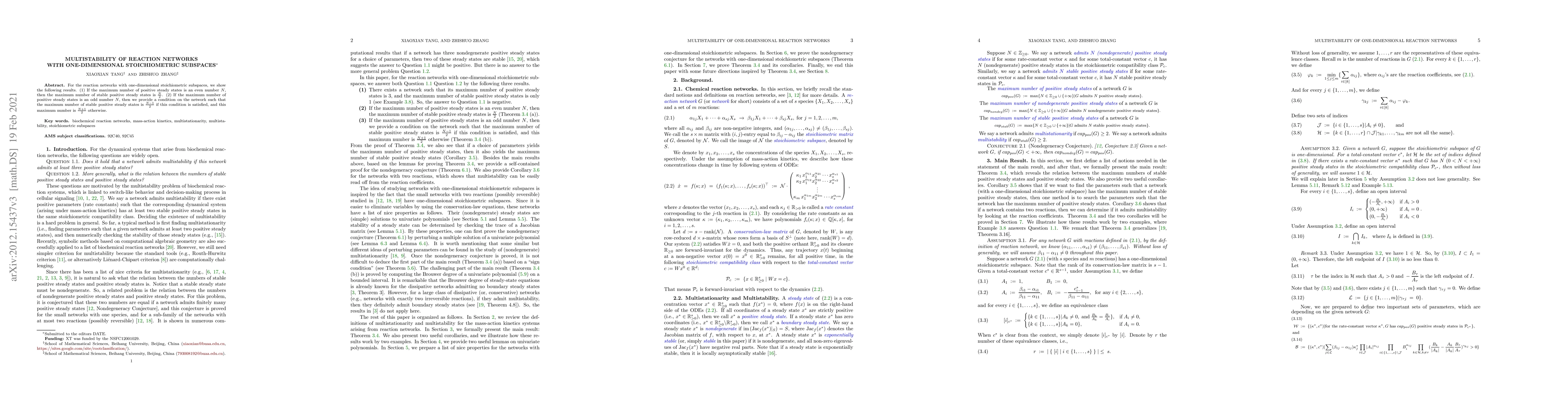 This paper investigates reaction networks with one-dimensional stoichiometric subspaces, demonstrating that the maximum number of stable positive steady states is N/2 when N is even, and either (N-1)/2 or (N+1)/2 depending on a specific network condition when N is odd.