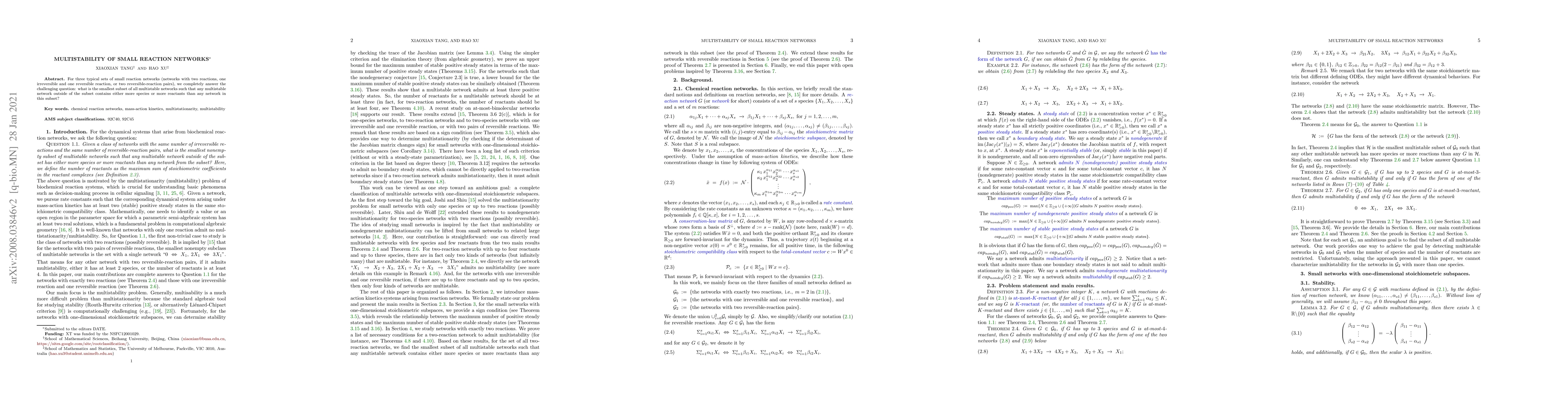 For three typical sets of small reaction networks (networks with two reactions, one irreversible and one reversible reaction, or two reversible-reaction pairs), we completely answer the challenging question: what is the smallest subset of all multistable networks such that any multistable network outside of the subset contains either more species or more reactants than any network in this subset?