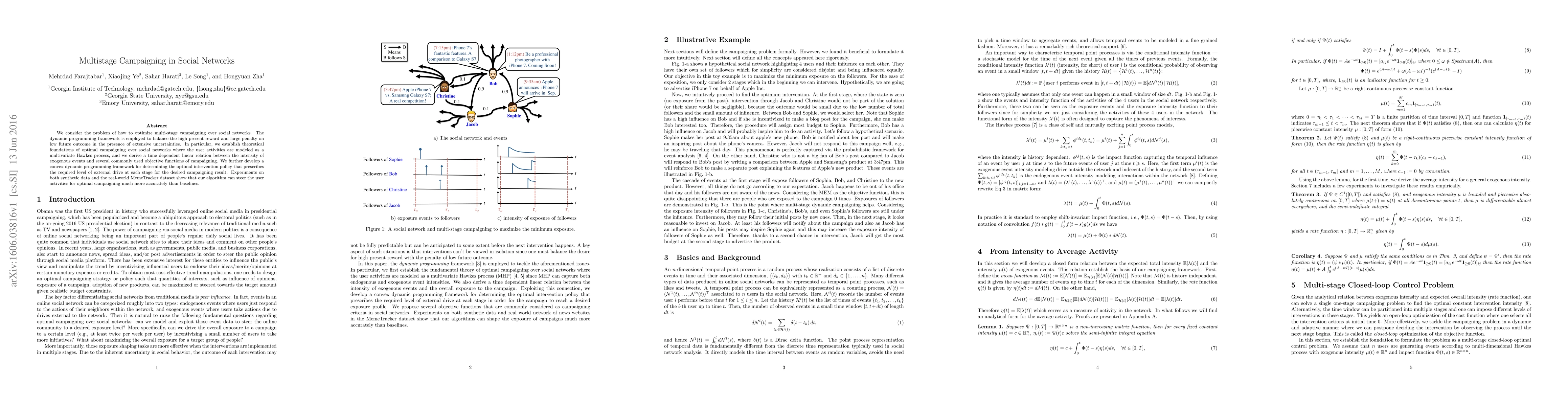 We consider the problem of how to optimize multi-stage campaigning over social networks. The dynamic programming framework is employed to balance the high present reward and large penalty on low future outcome in the presence of extensive uncertainties. In particular, we establish theoretical foundations of optimal campaigning over social networks where the user activities are modeled as a multivariate Hawkes process, and we derive a time dependent linear relation between the intensity of exogenous events and several commonly used objective functions of campaigning. We further develop a convex dynamic programming framework for determining the optimal intervention policy that prescribes the required level of external drive at each stage for the desired campaigning result. Experiments on both synthetic data and the real-world MemeTracker dataset show that our algorithm can steer the user activities for optimal campaigning much more accurately than baselines.