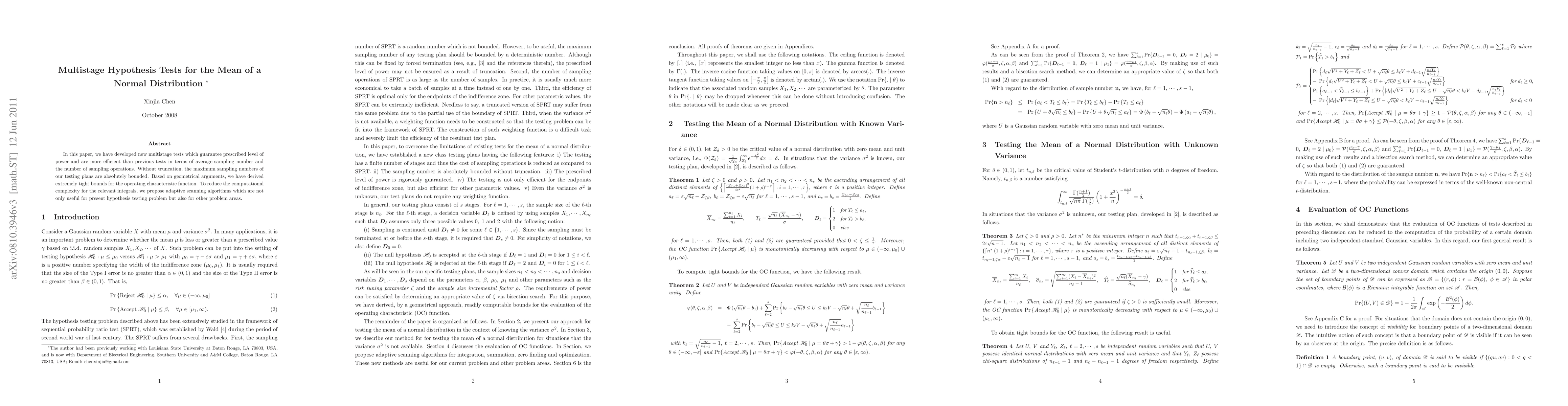 The paper introduces novel multistage hypothesis testing schemes for normal distribution means, providing methods with guaranteed power and improved sampling efficiency, alongside adaptive scanning algorithms for integral computations.