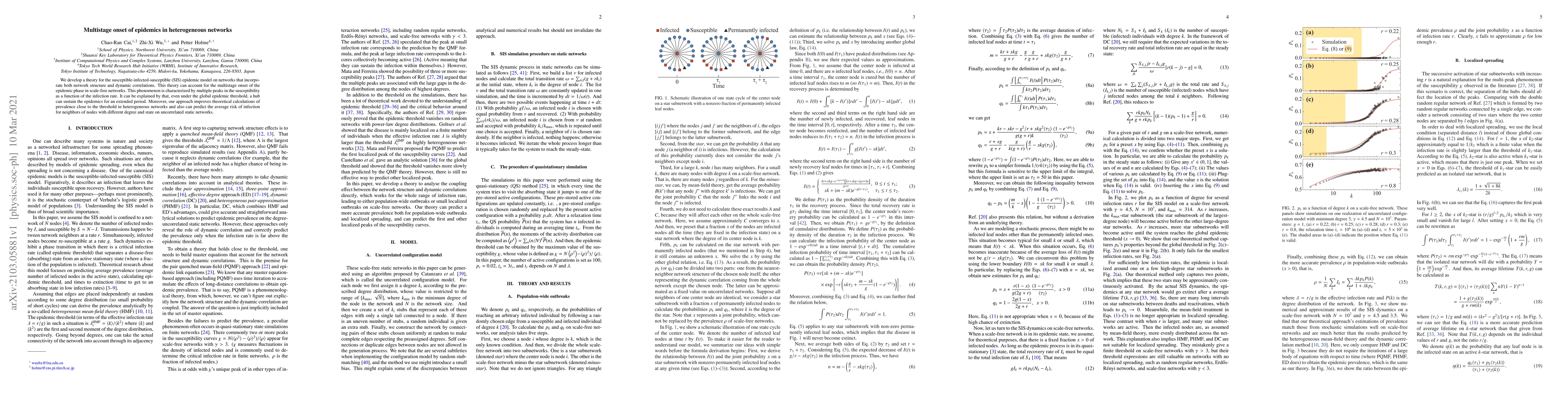 We develop a theory for the susceptible-infected-susceptible (SIS) epidemic model on networks that incorporate both network structure and dynamic correlations. This theory can account for the multistage onset of the epidemic phase in scale-free networks. This phenomenon is characterized by multiple peaks in the susceptibility as a function of the infection rate. It can be explained by that, even under the global epidemic threshold, a hub can sustain the epidemics for an extended period. Moreover, our approach improves theoretical calculations of prevalence close to the threshold in heterogeneous networks and also can predict the average risk of infection for neighbors of nodes with different degree and state on uncorrelated static networks.