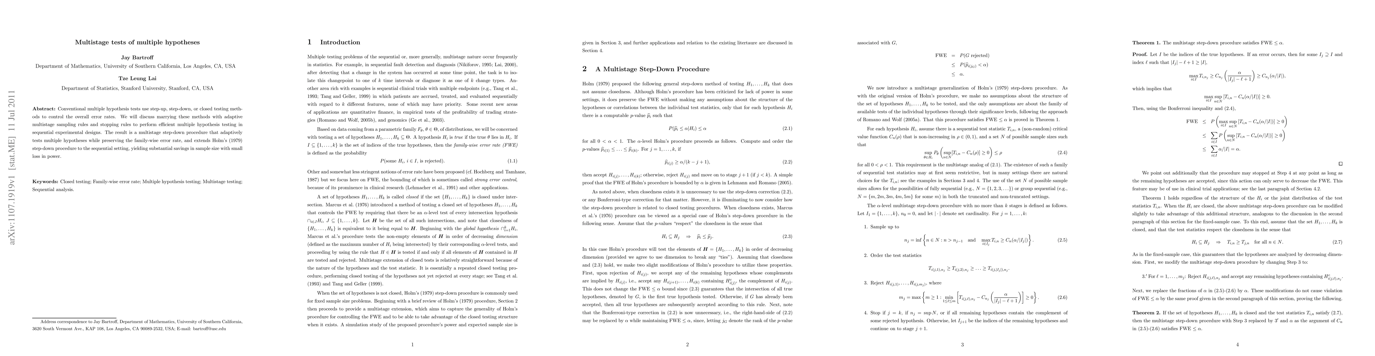Conventional multiple hypothesis tests use step-up, step-down, or closed testing methods to control the overall error rates. We will discuss marrying these methods with adaptive multistage sampling rules and stopping rules to perform efficient multiple hypothesis testing in sequential experimental designs. The result is a multistage step-down procedure that adaptively tests multiple hypotheses while preserving the family-wise error rate, and extends Holm's (1979) step-down procedure to the sequential setting, yielding substantial savings in sample size with small loss in power.