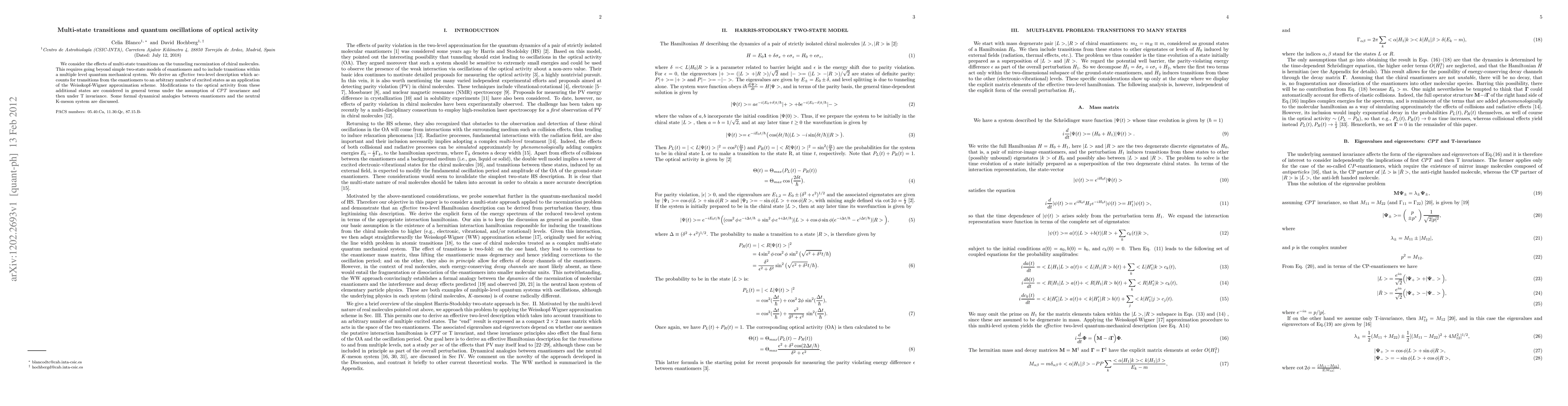 This paper explores multistate transitions in chiral molecules' tunneling racemization, extending beyond simple two-state models to include multiple-level quantum systems. It derives an effective two-level description using the Weisskopf-Wigner approximation, examining modifications to optical activity under \textit{CPT} and T invariance, and draws analogies to the neutral K-meson system.