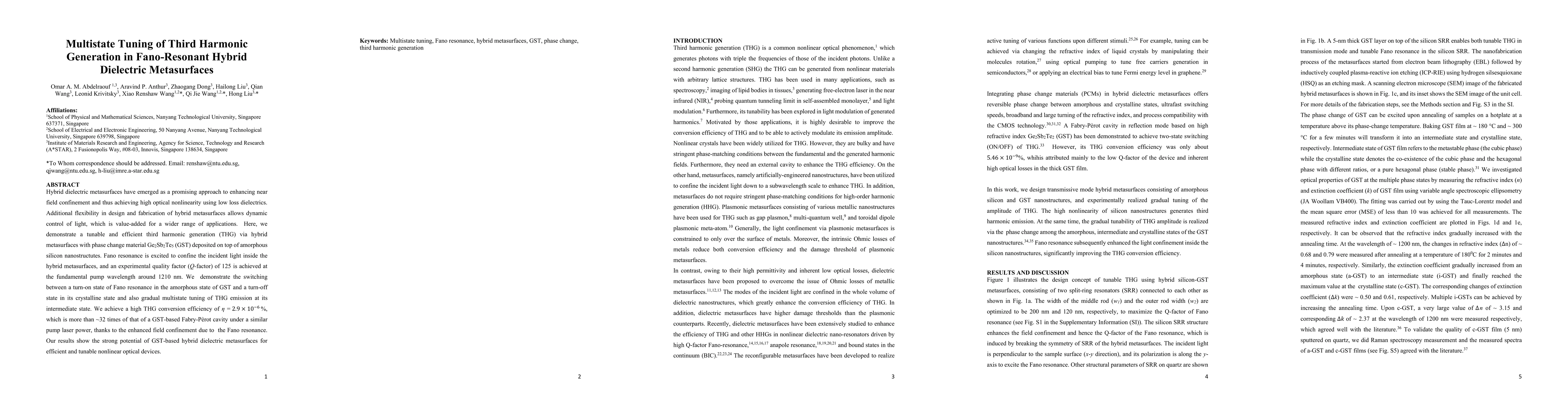 This research demonstrates tunable and efficient third harmonic generation (THG) in hybrid dielectric metasurfaces using phase change material Ge2Sb2Te5 (GST) deposited on amorphous silicon nanostructures. The Fano resonance enhances optical nonlinearity, achieving a high $Q$-factor of 125 and multistate tuning of THG emission via switching between amorphous and crystalline states of GST.
