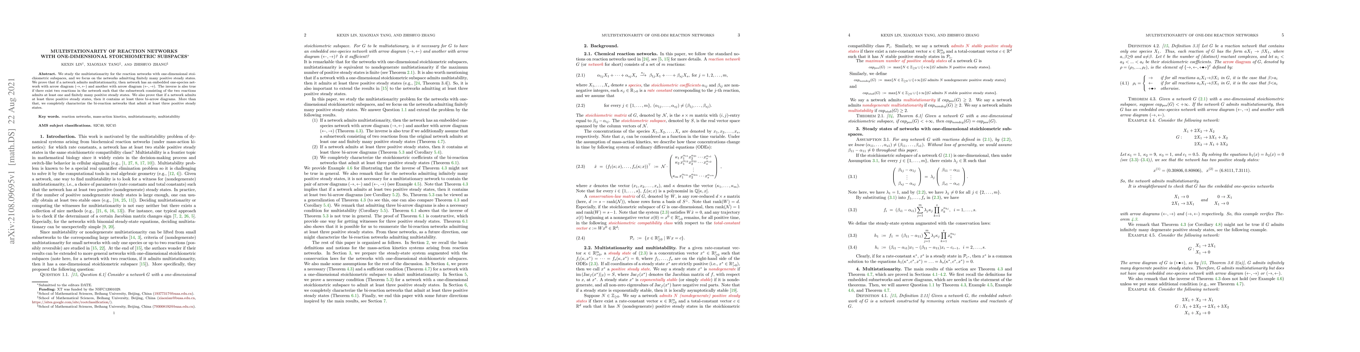 This paper investigates multistationarity in reaction networks with one-dimensional stoichiometric subspaces, proving that such networks with multistationarity contain embedded one-species networks with specific arrow diagrams. It also characterizes bi-reaction networks with at least three positive steady states.