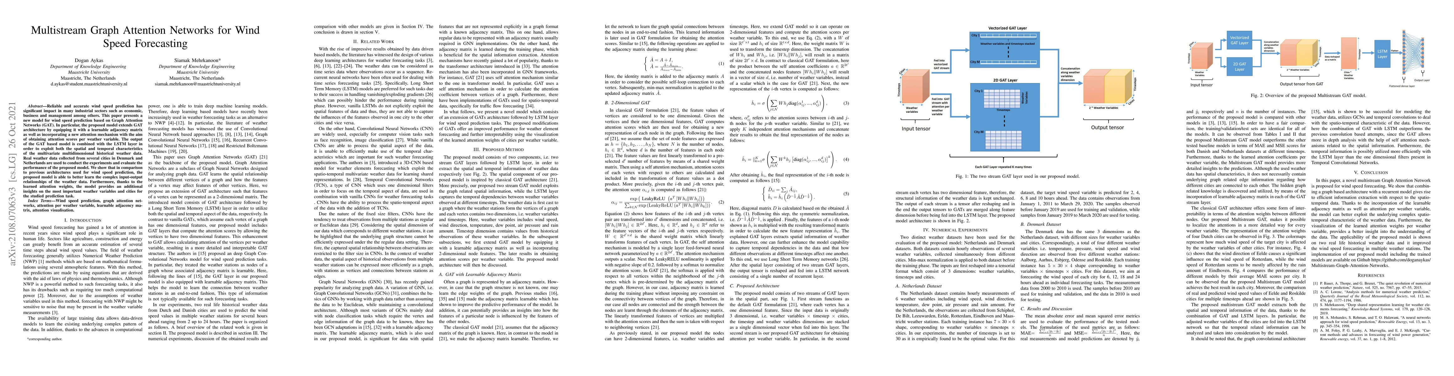 This paper introduces a Multistream Graph Attention Network for wind speed forecasting, combining a learnable adjacency matrix and a novel attention mechanism to enhance prediction accuracy. The model integrates GAT with LSTM layers to capture spatial and temporal features from multivariate historical weather data, outperforming previous models and offering insights into important weather variables and cities.