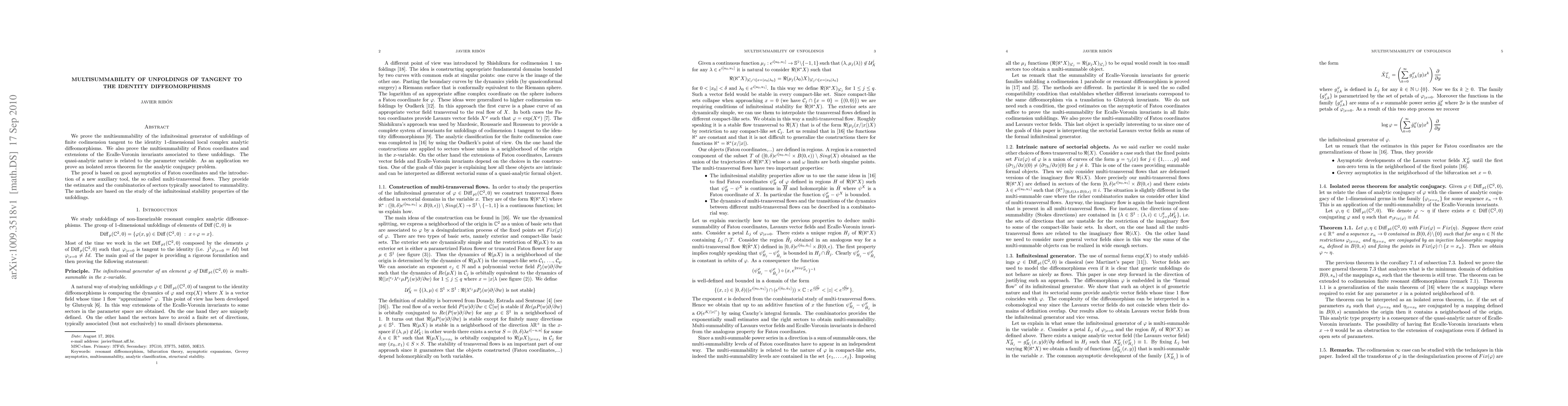 This paper proves the multisummability of unfoldings of tangent diffeomorphisms and their associated invariants, with implications for the analytic conjugacy problem, including an isolated zeros theorem.
