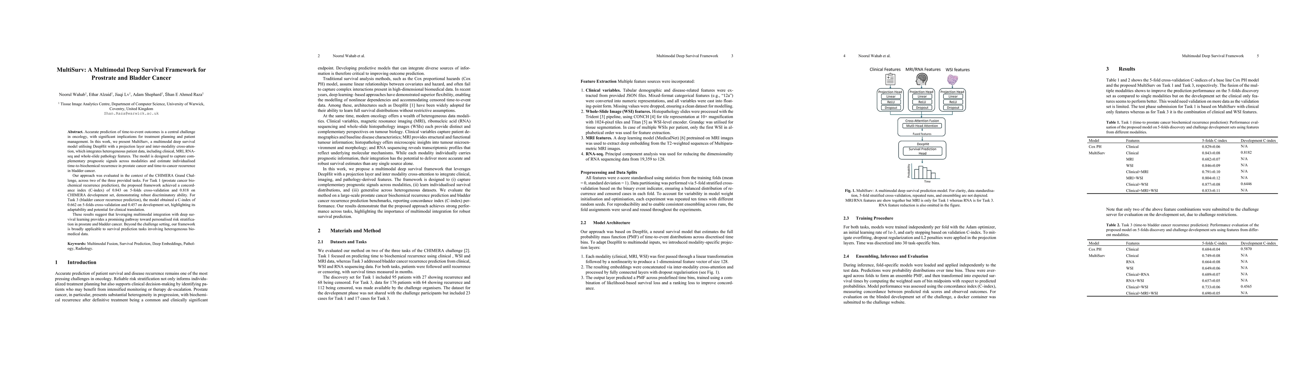 Accurate prediction of time-to-event outcomes is a central challenge in oncology, with significant implications for treatment planning and patient management. In this work, we present MultiSurv, a multimodal deep survival model utilising DeepHit with a projection layer and inter-modality cross-attention, which integrates heterogeneous patient data, including clinical, MRI, RNA-seq and whole-slide pathology features. The model is designed to capture complementary prognostic signals across modalities and estimate individualised time-to-biochemical recurrence in prostate cancer and time-to-cancer recurrence in bladder cancer. Our approach was evaluated in the context of the CHIMERA Grand Challenge, across two of the three provided tasks. For Task 1 (prostate cancer bio-chemical recurrence prediction), the proposed framework achieved a concordance index (C-index) of 0.843 on 5-folds cross-validation and 0.818 on CHIMERA development set, demonstrating robust discriminatory ability. For Task 3 (bladder cancer recurrence prediction), the model obtained a C-index of 0.662 on 5-folds cross-validation and 0.457 on development set, highlighting its adaptability and potential for clinical translation. These results suggest that leveraging multimodal integration with deep survival learning provides a promising pathway toward personalised risk stratification in prostate and bladder cancer. Beyond the challenge setting, our framework is broadly applicable to survival prediction tasks involving heterogeneous biomedical data.