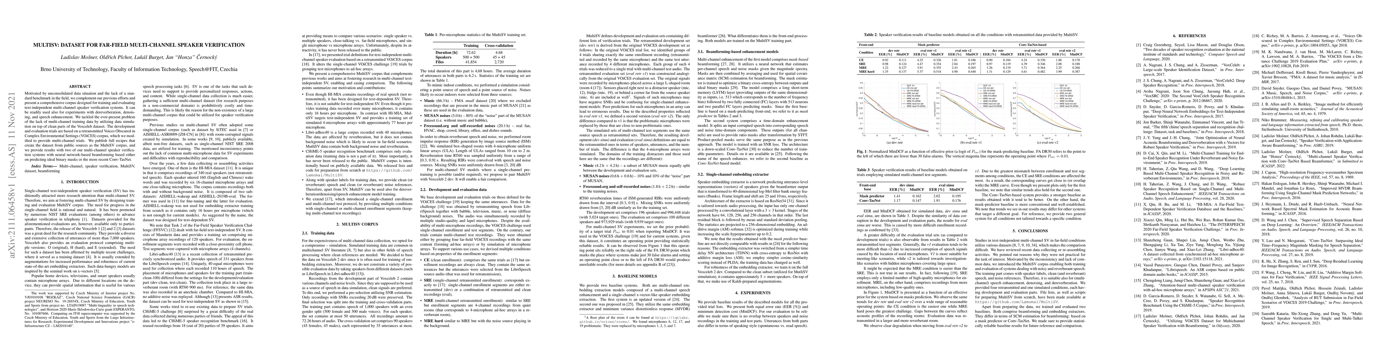 Motivated by unconsolidated data situation and the lack of a standard benchmark in the field, we complement our previous efforts and present a comprehensive corpus designed for training and evaluating text-independent multi-channel speaker verification systems. It can be readily used also for experiments with dereverberation, denoising, and speech enhancement. We tackled the ever-present problem of the lack of multi-channel training data by utilizing data simulation on top of clean parts of the Voxceleb dataset. The development and evaluation trials are based on a retransmitted Voices Obscured in Complex Environmental Settings (VOiCES) corpus, which we modified to provide multi-channel trials. We publish full recipes that create the dataset from public sources as the MultiSV corpus, and we provide results with two of our multi-channel speaker verification systems with neural network-based beamforming based either on predicting ideal binary masks or the more recent Conv-TasNet.