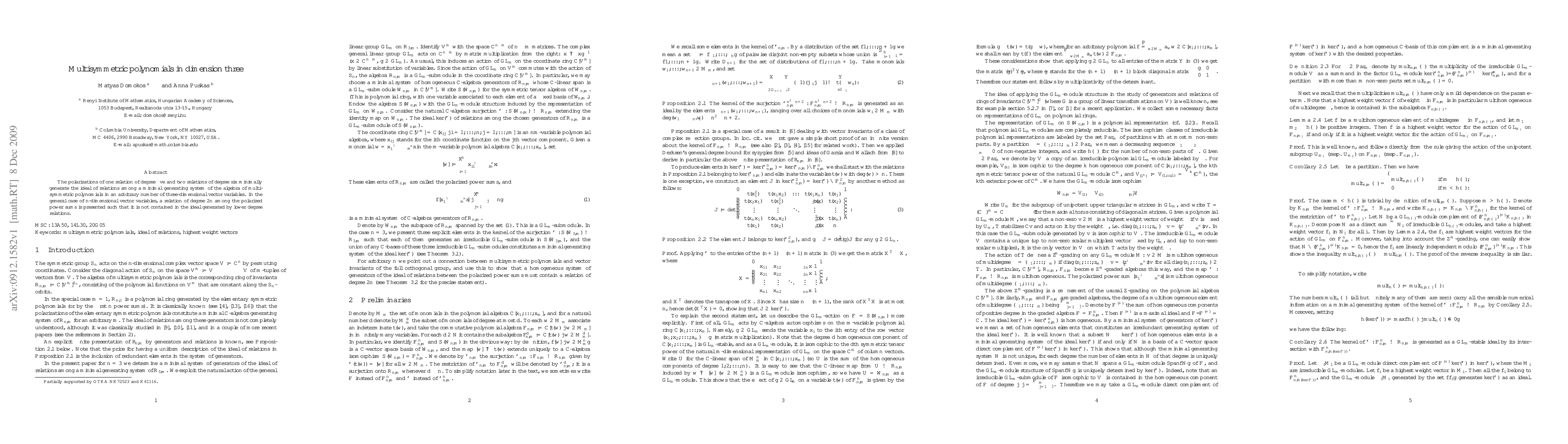 The polarizations of one relation of degree five and two relations of degree six minimally generate the ideal of relations among a minimal generating system of the algebra of multisymmetric polynomials in an arbitrary number of three-dimensional vector variables. In the general case of $n$-dimensional vector variables, a relation of degree $2n$ among the polarized power sums is presented such that it is not contained in the ideal generated by lower degree relations.