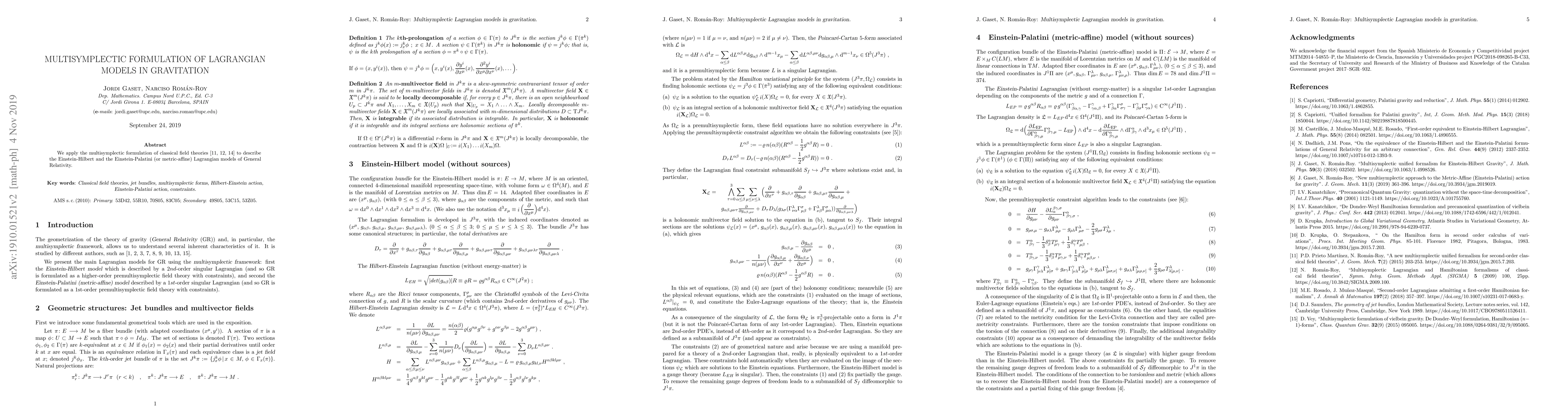 Researchers applied multisymplectic formulation to Einstein-Hilbert and Einstein-Palatini models of General Relativity, enabling a new understanding of gravitation through classical field theories.