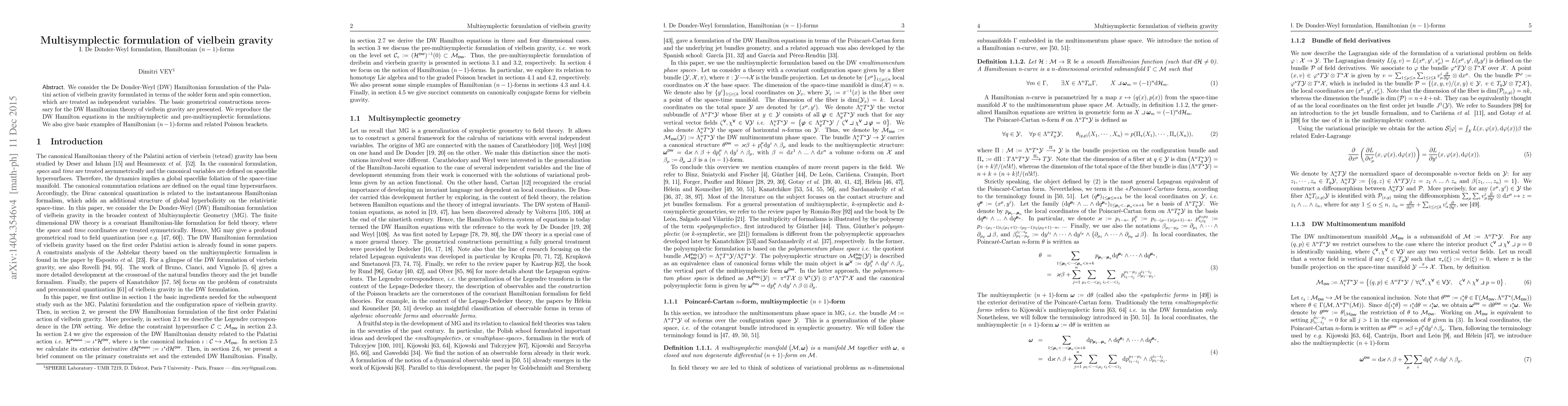 This paper explores the De Donder-Weyl Hamiltonian formulation of vielbein gravity, treating the solder form and spin connection as independent variables. It presents the necessary geometrical constructions and reproduces the Hamilton equations in multisymplectic and pre-multisymplectic formulations, along with examples of Hamiltonian (n-1)-forms and their Poisson brackets.