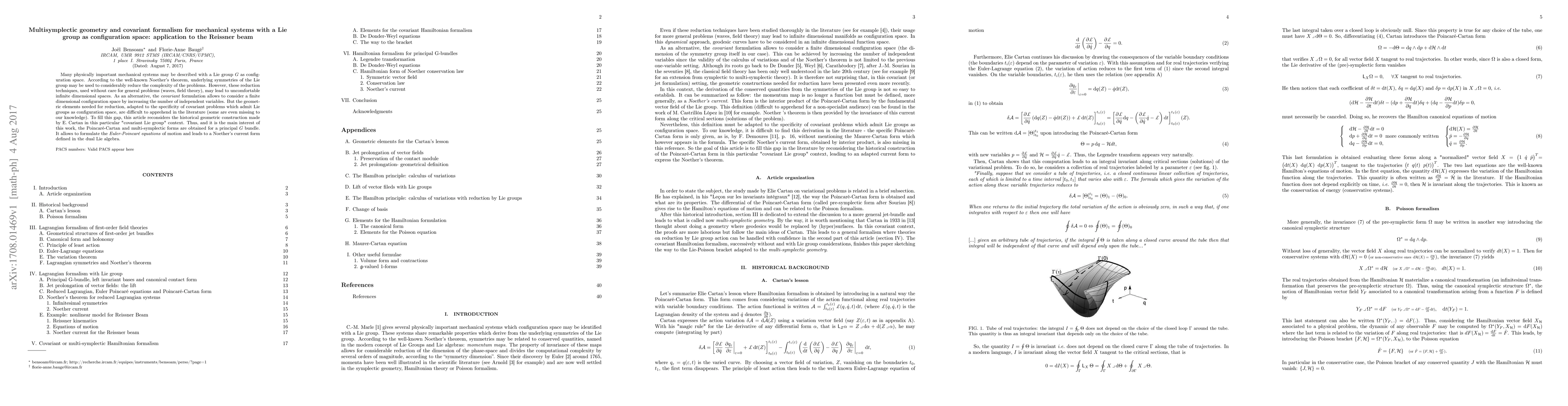 Many physically important mechanical systems may be described with a Lie group $G$ as configuration space. According to the well-known Noether's theorem, underlying symmetries of the Lie group may be used to considerably reduce the complexity of the problems. However, these reduction techniques, used without care for general problems (waves, field theory), may lead to uncomfortable infinite dimensional spaces. As an alternative, the \emph{covariant} formulation allows to consider a finite dimensional configuration space by increasing the number of independent variables. But the geometric elements needed for reduction, adapted to the specificity of covariant problems which admit Lie groups as configuration space, are difficult to apprehend in the literature (some are even missing to our knowledge). To fill this gap, this article reconsiders the historical geometric construction made by E. Cartan in this particular "covariant Lie group" context. Thus, and it is the main interest of this work, the Poincar\'e-Cartan and multi-symplectic forms are obtained for a principal $G$ bundle. It allows to formulate the \emph{Euler-Poincar\'e equations} of motion and leads to a Noether's current form defined in the dual Lie algebra.