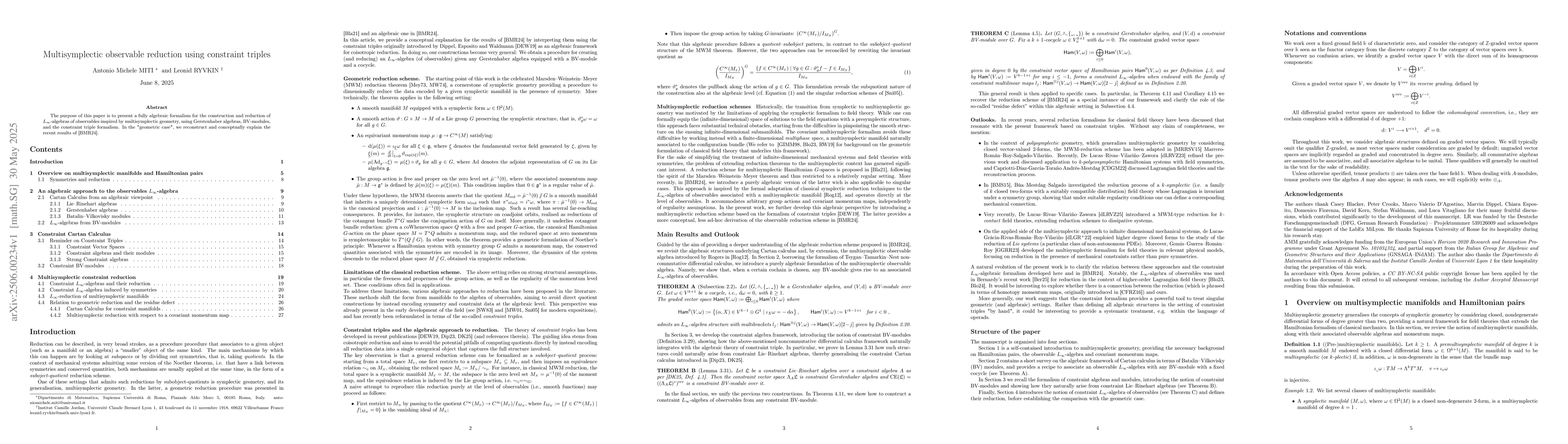 The paper presents a fully algebraic formalism for constructing and reducing $L_\infty$-algebras of observables, employing Gerstenhaber algebras, BV-modules, and the constraint triple formalism, with a focus on multisymplectic geometry.