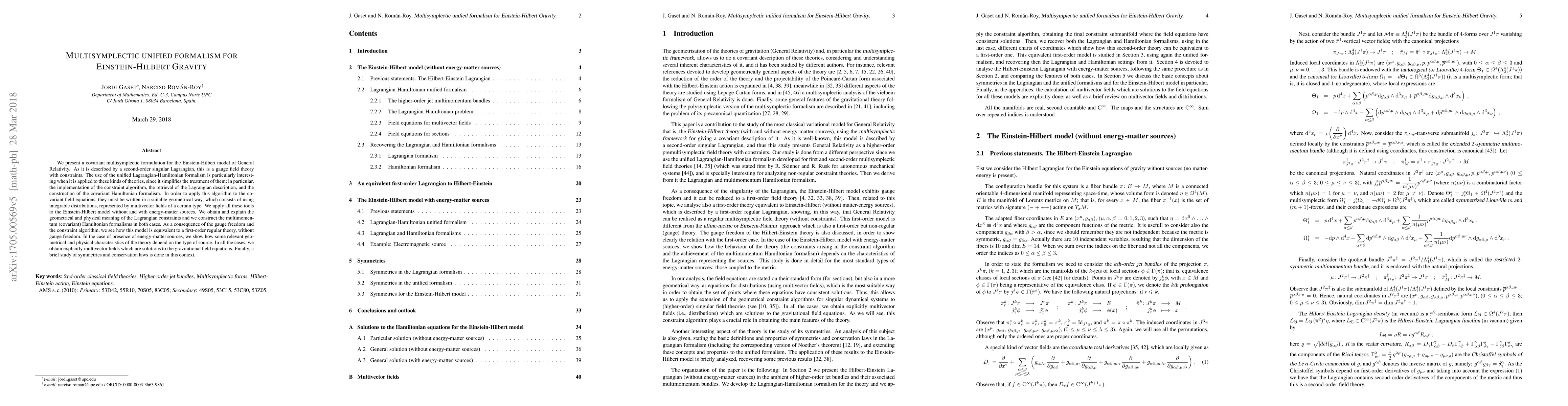 We present a covariant multisymplectic formulation for the Einstein-Hilbert model of General Relativity. As it is described by a second-order singular Lagrangian, this is a gauge field theory with constraints. The use of the unified Lagrangian-Hamiltonian formalism is particularly interesting when it is applied to these kinds of theories, since it simplifies the treatment of them; in particular, the implementation of the constraint algorithm, the retrieval of the Lagrangian description, and the construction of the covariant Hamiltonian formalism. In order to apply this algorithm to the covariant field equations, they must be written in a suitable geometrical way, which consists of using integrable distributions, represented by multivector fields of a certain type. We apply all these tools to the Einstein-Hilbert model without and with energy-matter sources. We obtain and explain the geometrical and physical meaning of the Lagrangian constraints and we construct the multimomentum (covariant) Hamiltonian formalisms in both cases. As a consequence of the gauge freedom and the constraint algorithm, we see how this model is equivalent to a first-order regular theory, without gauge freedom. In the case of presence of energy-matter sources, we show how some relevant geometrical and physical characteristics of the theory depend on the type of source. In all the cases, we obtain explicitly multivector fields which are solutions to the gravitational field equations. Finally, a brief study of symmetries and conservation laws is done in this context.