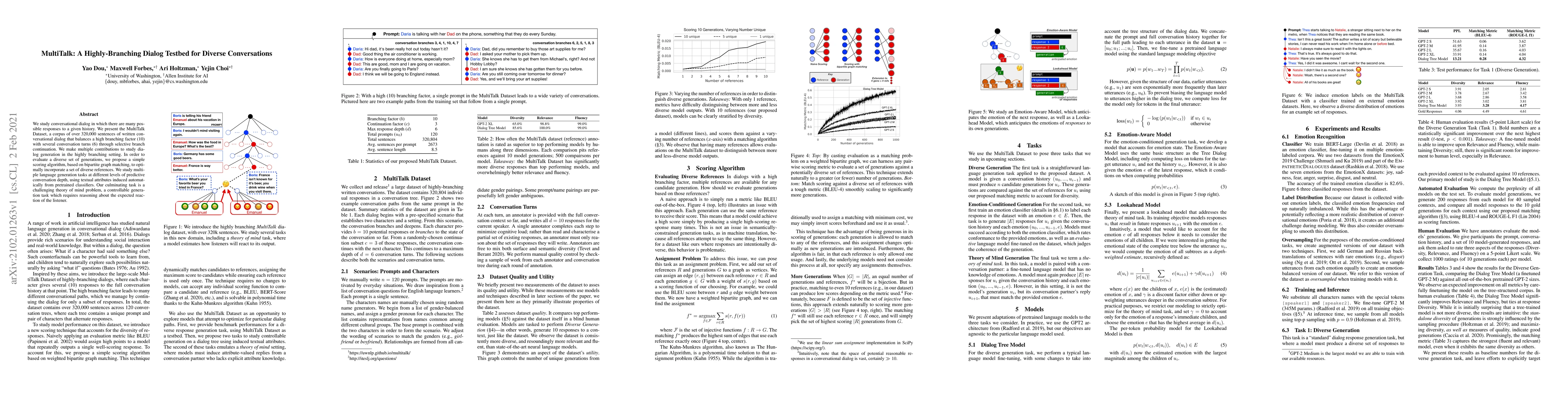 The MultiTalk Dataset offers a rich corpus for studying highly branching conversational dialogs, balancing complexity and turn length. The paper introduces a scoring algorithm for evaluating diverse dialog generations and explores various language generation tasks, culminating in a challenging theory of mind problem.
