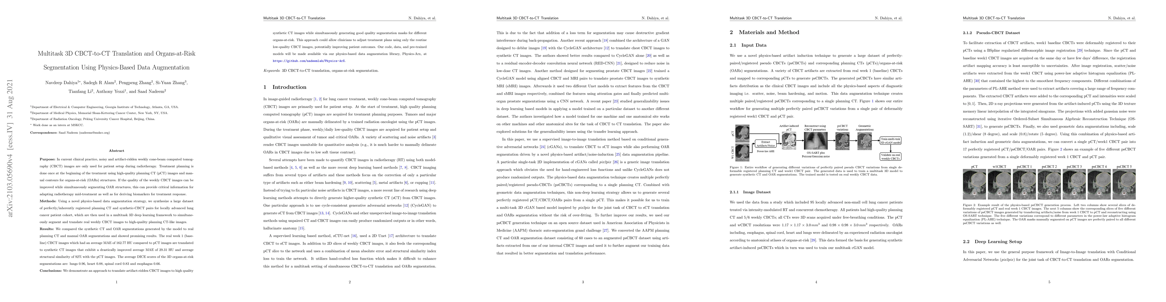 This paper proposes a multitask deep learning framework using physics-based data augmentation to translate noisy CBCT images to high-quality CT-like images and segment organs-at-risk, potentially enabling mid-treatment radiotherapy adjustments. The model shows significant improvements in image quality and segmentation accuracy.