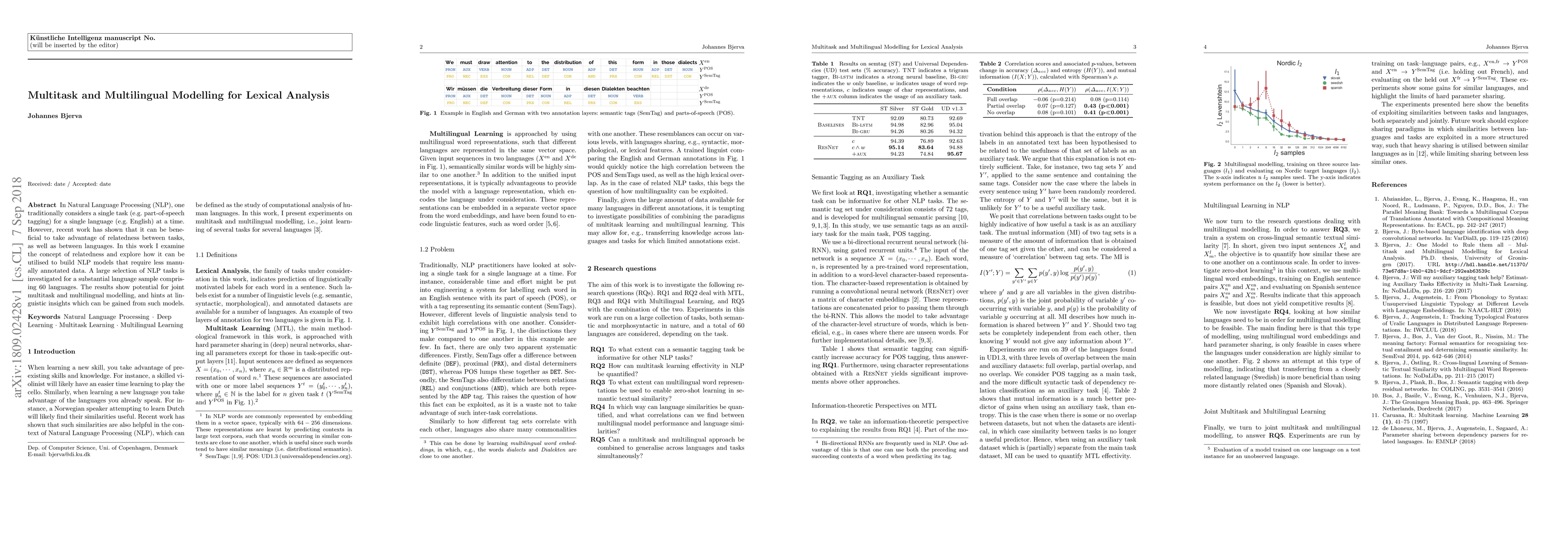 In Natural Language Processing (NLP), one traditionally considers a single task (e.g. part-of-speech tagging) for a single language (e.g. English) at a time. However, recent work has shown that it can be beneficial to take advantage of relatedness between tasks, as well as between languages. In this work I examine the concept of relatedness and explore how it can be utilised to build NLP models that require less manually annotated data. A large selection of NLP tasks is investigated for a substantial language sample comprising 60 languages. The results show potential for joint multitask and multilingual modelling, and hints at linguistic insights which can be gained from such models.