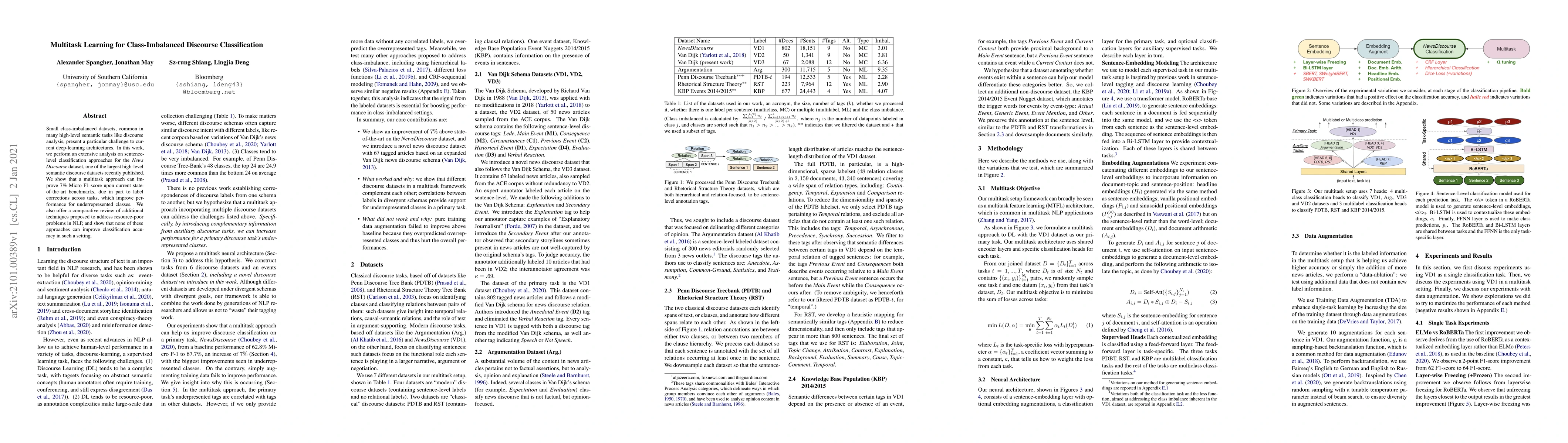 Small class-imbalanced datasets, common in many high-level semantic tasks like discourse analysis, present a particular challenge to current deep-learning architectures. In this work, we perform an extensive analysis on sentence-level classification approaches for the News Discourse dataset, one of the largest high-level semantic discourse datasets recently published. We show that a multitask approach can improve 7% Micro F1-score upon current state-of-the-art benchmarks, due in part to label corrections across tasks, which improve performance for underrepresented classes. We also offer a comparative review of additional techniques proposed to address resource-poor problems in NLP, and show that none of these approaches can improve classification accuracy in such a setting.
