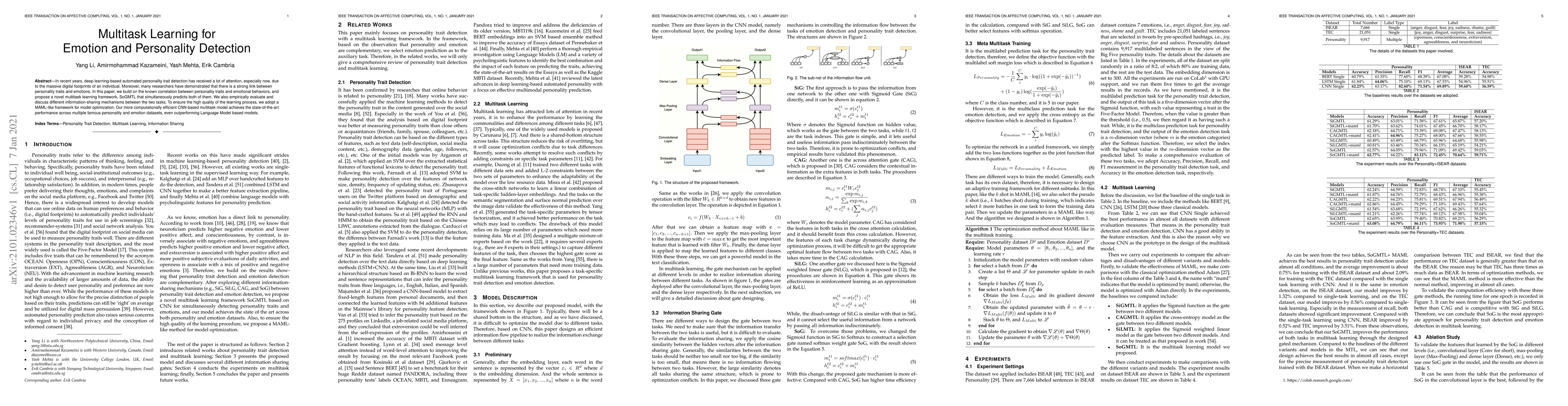 This paper proposes a novel multitask learning framework, SoGMTL, to simultaneously predict personality traits and emotions using deep learning. It achieves state-of-the-art performance on multiple datasets, outperforming language model-based approaches, and demonstrates the effectiveness of information sharing between the two tasks.